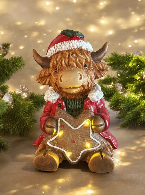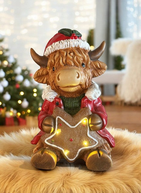 LED Deko Hochlandrind mit 4 LED sitzend mit Stern in der Hand