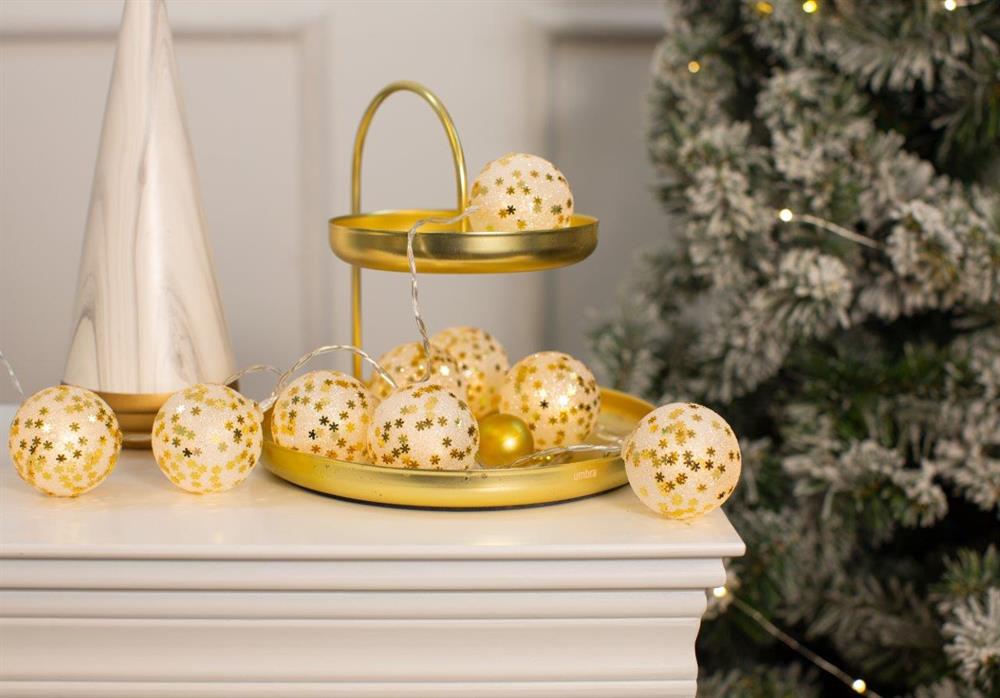 LED Lichterkette mit 10 LED Glitter auf weissen Kugeln mit goldigen Schneeflocken