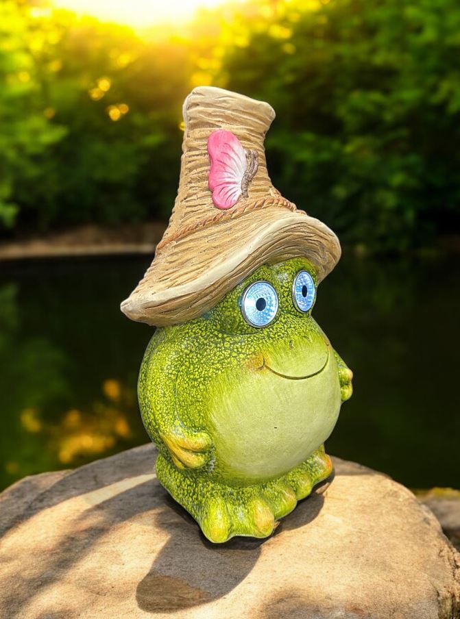 LED Solar Figur Frosch grün mit Hut und rotem Schmetterling