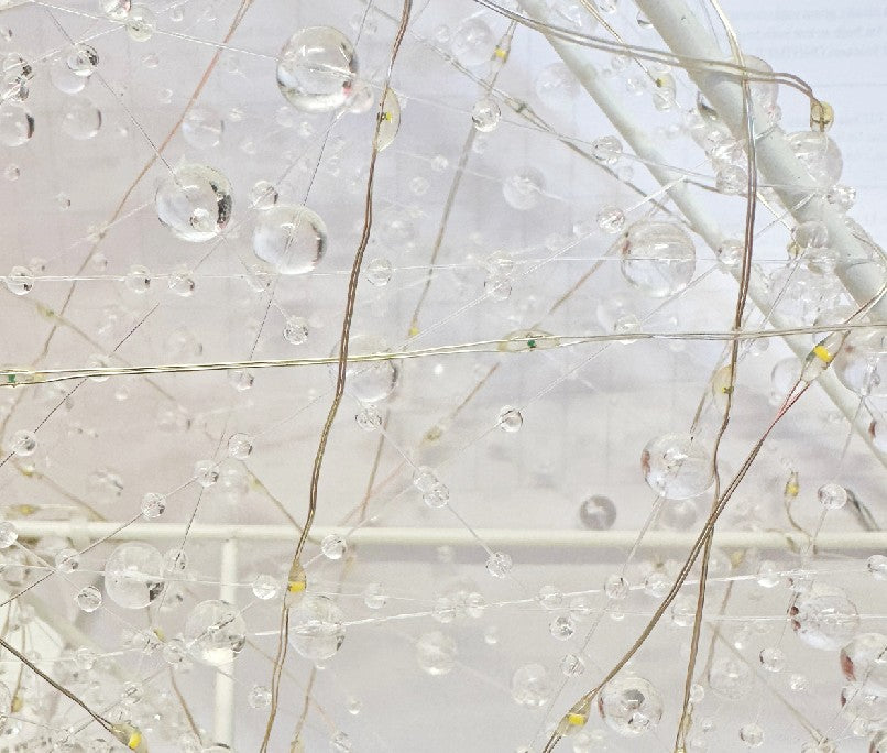 mit weissen Kristallpunkten schöner Glittereffekt warm weisses Licht Timer Funktion - Schaltet sich täglich zur selben Zeit ein und leuchtet für 6 Stunden ON / TIMER / OFF Schalter Abstand zwischen LED: 5cm Zuleitung: 500cm IP55 Adapter: 4.5V/6W Material: Metall und Kunststoff (PET) L7.5cm x B48cm x H60cm inklusive VRB / CHF 00.18
