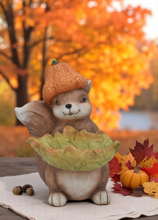 Deko Eichhörnchen sitzend mit Blatt in den Armen aus Polyresin
