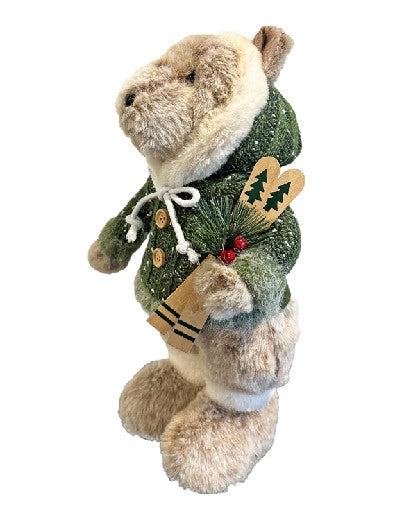 Deko Bär stehend grün mit Kapuze und Ski in der Hand