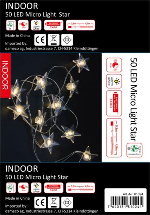LED Micro Draht Lichterkette mit 50 LED und Sternen L: 490cm silber Draht