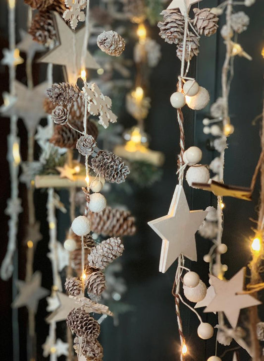 LED Girlande Holz mit 20 LED mit Tannenzapfen, weisse Beeren und Holzsterne - L: 200cm