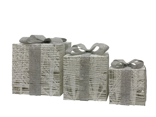 LED Geschenkboxen 3er Set mit Cotton - silber Masche mit total 72 LED