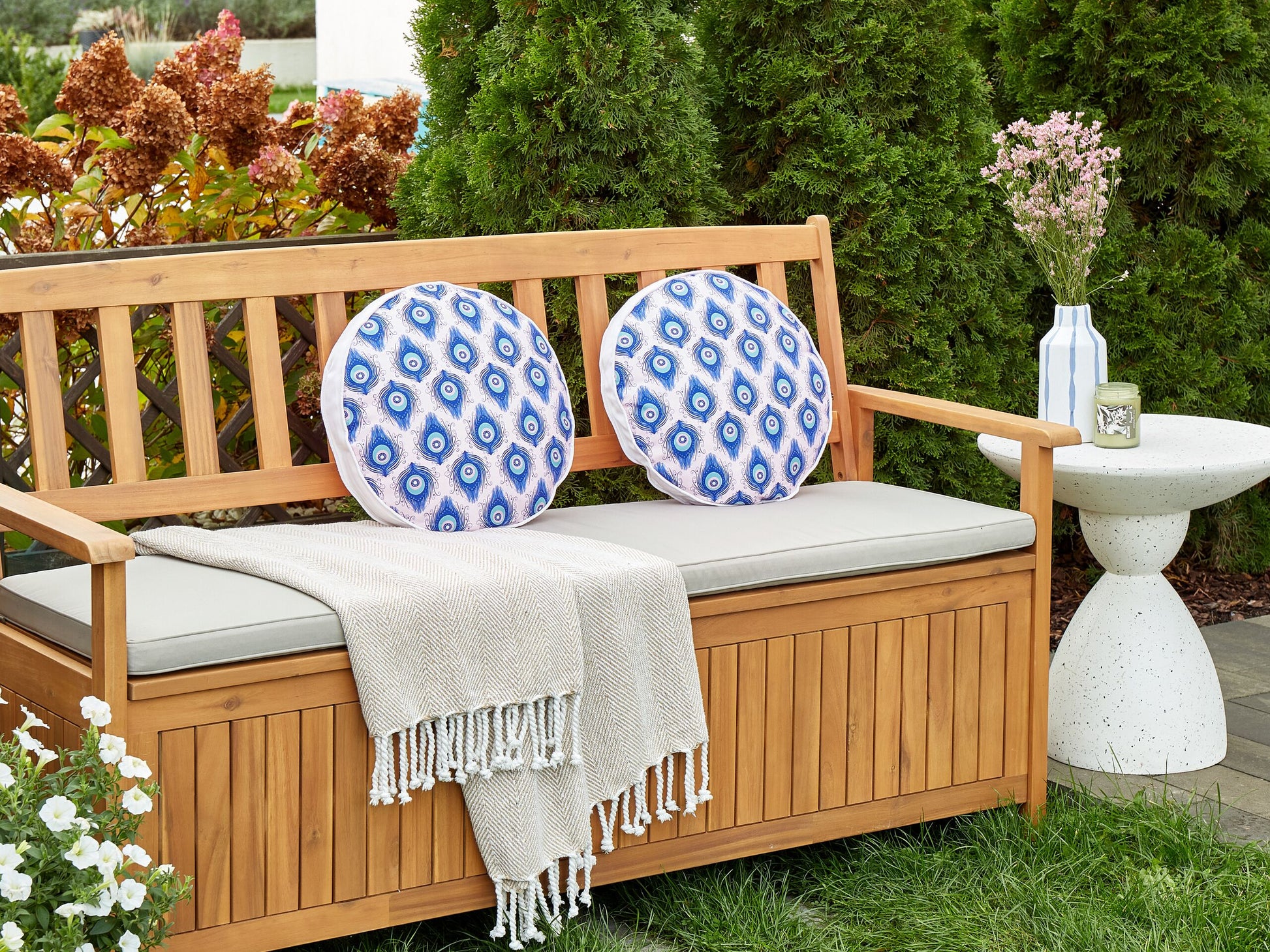 Dieses Kissenset zeigt ein herrliches Pfauenfedermuster in satten Blautönen und verleiht jedem Aussenbereich einen Hauch von naturinspirierter Schönheit. Jedes Kissen besteht aus hochwertigem, pflegeleichtem und strapazierfähigem Polyester und hat einen abnehmbaren Bezug, der sich leicht waschen lässt. Ausserdem sind die Bezüge wasserabweisend und somit ideal für Garten und Balkon. Das komplizierte Muster und die klassische Struktur machen diese Kissen zu einem hervorragenden Element sowohl für moderne als auch für traditionelle Einrichtungen. Material: Polyester. Material Zusammensetzung: 100% Polyester Montage: Benötigt keine Montage Das Angebot beinhaltet: 2 x Gartenkissen Höhe: 10 zusätzliche Information: Das Kissen ist vakuumverpackt. Nehmen Sie Ihr Kissen aus der Verpackung heraus und lassen Sie es 24 Stunden lang liegen, bis es seine volle Dichte erreicht. Gestalten: Rund Breite: 40 Tiefe: 40 Art: Gartenkissen 2er Set Stil: Modern Allgemeine Farbe: Blau Muster: Tiermuster Hauptmaterial: Polyester Füllmaterial: Polyester