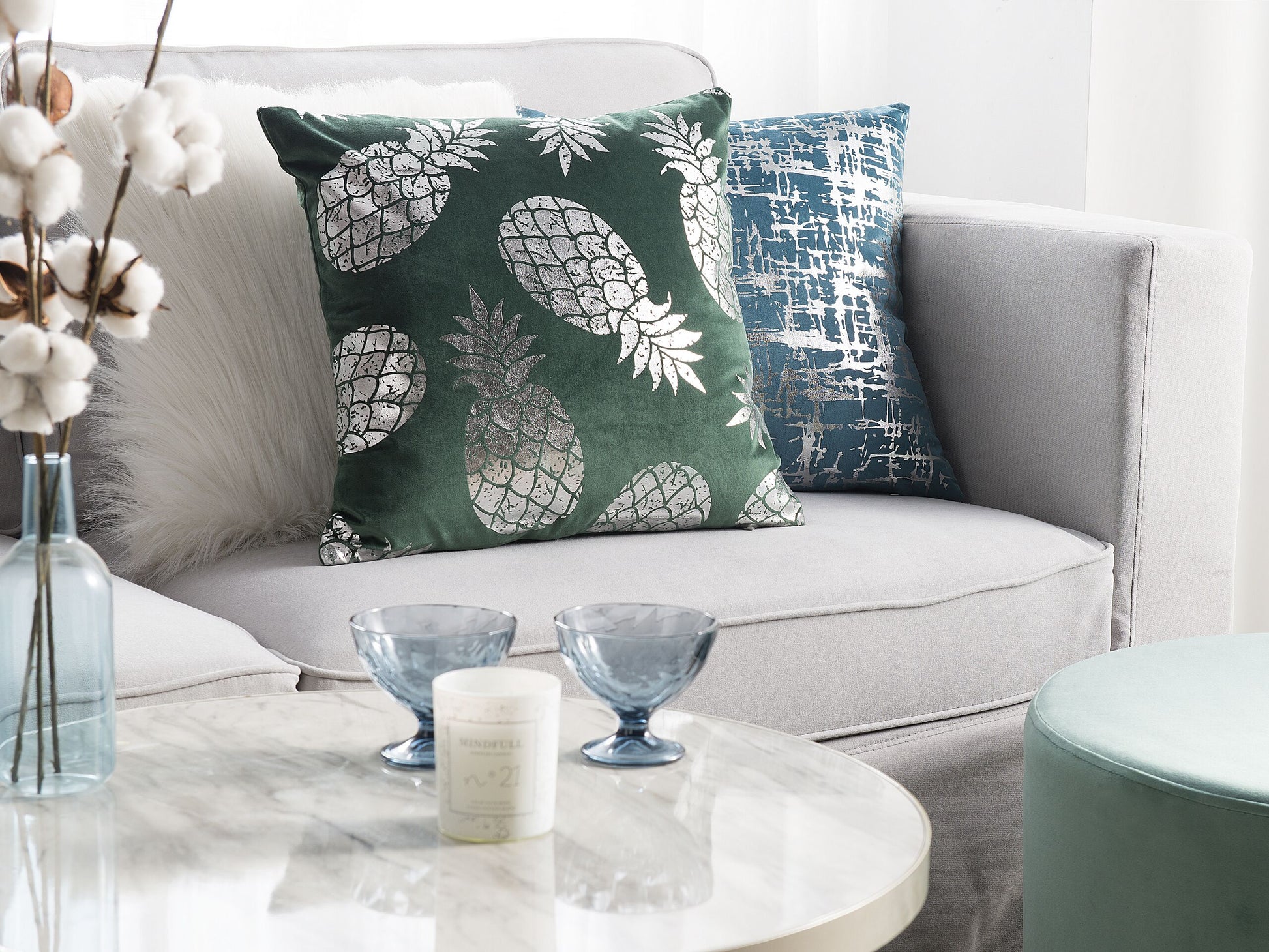 Das elegante Motiv in glänzendem Silber verleiht diesem Kissen-Set einen dekorativen Charakter, perfekt für alle edlen, modernen und stilvollen Inneneinrichtungen. Zudem ist es dank des samtig weichen Materials sehr angenehm in der Haptik und lädt zum kuscheln ein. Die intensive dunkelgrüne Farbe harmoniert gut mit verschiedenen, anderen Accessoires. Material: Samtstoff. Material Zusammensetzung: 100% Polyester Montage: Benötigt keine Montage Das Angebot beinhaltet: 2 x Zierkissen Höhe: 12 zusätzliche Information: Das Kissen ist vakuumverpackt. Nehmen Sie Ihr Kissen aus der Verpackung heraus und lassen Sie es 24 Stunden lang liegen, bis es seine volle Dichte erreicht., Bitte beachten Sie, dass Samtstoff unter verschiedenen Lichtverhältnissen eine andere Optik haben kann – das Material schimmert bei Tageslicht stärker und wirkt bei künstlicher Beleuchtung in Innenräumen eher gedämpft. Aufgrund der glatten, hochdichten Struktur des Gewebes kann sein Farbton auch variieren, wenn man mit der Hand in verschiedene Richtungen und Winkel über den Stoff fährt. Um den Farbton auszugleichen und Druckstellen zu vermeiden, sollte der Webstoff sanft mit einer offenen Handfläche in eine Richtung gestrichen, mit einem feuchten Tuch abgewischt oder einem Dampfbügeleisen gebügelt werden. Gestalten: Quadratisch Breite: 45 Tiefe: 45 Art: Dekokissen 2er Set Stil: Modern Allgemeine Farbe: Grün Schatten: Dunkelgrün Muster: Pflanzenmuster Hauptmaterial: Samtstoff Füllmaterial: Polyester