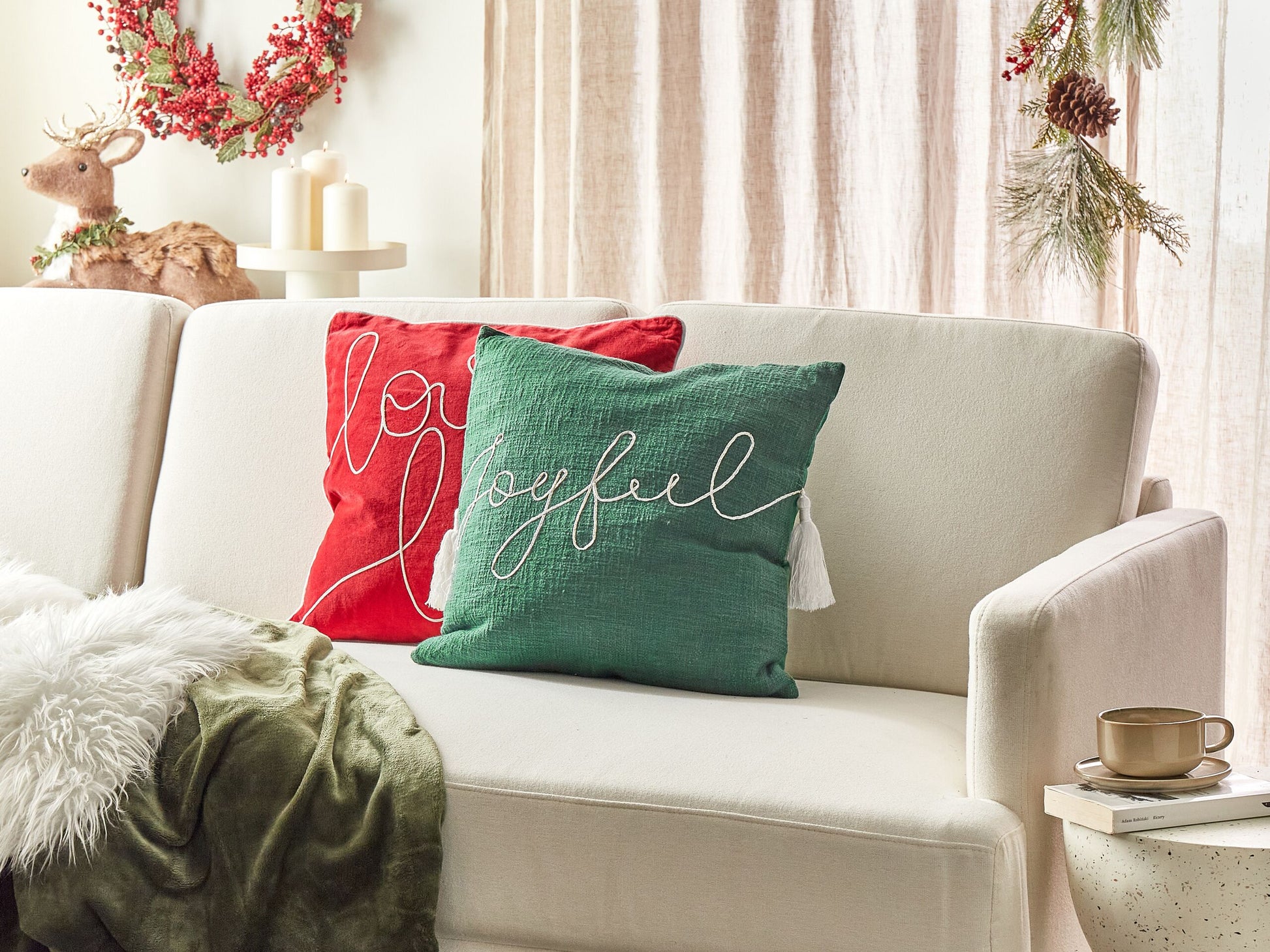 Setzen Sie einen weihnachtlichen Akzent in Ihrem Wohn- oder Schlafzimmer und dekorieren Sie sie mit diesem charmanten Zierkissen. Es ist mit einer weichen Polyester-Füllung versehen und verfügt über einen abnehmbaren Bezug aus strapazierfähiger Baumwolle. So ist die Kissenhülle sowohl langlebig als auch pflegeleicht. Die Kissen-Vorderseite sit mit einem weissen Schriftzug bestickt und an den Seiten mit Quasten verschönert. Dank seiner gemütlichen Ausstrahlung ist das Kissen eine großartige Ergänzung für jeden Wohnraum und Stil. Material: Baumwolle. Material Zusammensetzung: 100% Baumwolle Montage: Benötigt keine Montage Das Angebot beinhaltet: 1 x Zierkissen Höhe: 7 zusätzliche Information: Das Kissen ist vakuumverpackt. Nehmen Sie Ihr Kissen aus der Verpackung heraus und lassen Sie es 24 Stunden lang liegen, bis es seine volle Dichte erreicht. Gestalten: Quadratisch Breite: 45 Tiefe: 45 Art: Dekokissen Stil: Modern Allgemeine Farbe: Grün Muster: Weihnachtsmotiv Hauptmaterial: Baumwolle Füllmaterial: Polyester