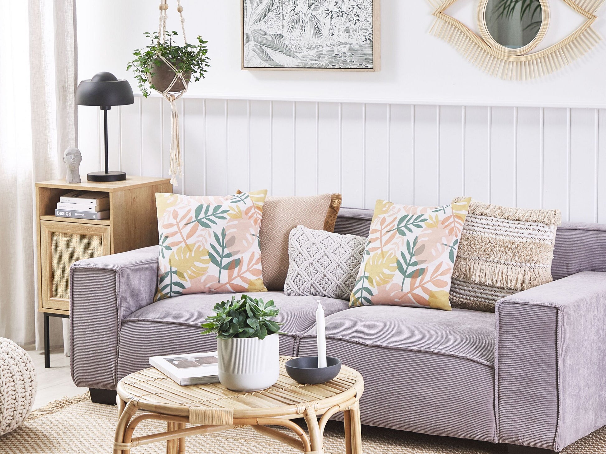 Mit ihren Bezügen, die mit einem Blattmuster bedruckt sind, setzen diese schönen Accessoires einen besonderen Akzent in Ihrer Einrichtung. Sie stellen eine praktische Ergänzung dar und ermöglichen es Ihnen, sich bequem auf Ihrem Sofa oder Bett zu entspannen. Die Bezüge lassen sich leicht abnehmen, so dass Sie sie problemlos reinigen können. Material: Polyester. Zusätzliches Material: Baumwolle, Leinen. Material Zusammensetzung: 10% Baumwolle, 10% Leinen, 80% Polyester Montage: Benötigt keine Montage Das Angebot beinhaltet: 2 x Zierkissen Höhe: 12 zusätzliche Information: Das Kissen ist vakuumverpackt. Nehmen Sie Ihr Kissen aus der Verpackung heraus und lassen Sie es 24 Stunden lang liegen, bis es seine volle Dichte erreicht. Gestalten: Quadratisch Breite: 45 Tiefe: 45 Art: Kissen 2er Set Stil: Klassisch Allgemeine Farbe: Bunt Muster: Pflanzenmuster Hauptmaterial: Polyester Füllmaterial: Polyester
