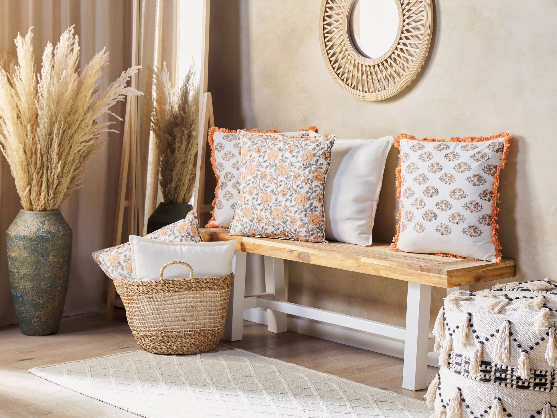 Beschreibung: Das Kissen Set zeichnet sich durch ein einzigartiges, florales Muster aus, das von Hand per Blockdruck hergestellt wurde. Die wunderschöne Farbkombination aus klassischem Cremeweiss mit dezentem Orange und Grau wird in jede Einrichtung frischen Wind einziehen lassen. Die weichen Kissenbezüge bestehen aus hochwertiger Baumwolle und sind mit dicken Füllungen versehen, so dass Sie die Sofakissen nicht nur für dekorative Zwecke, sondern auch zum Entspannen perfekt nutzen können. Die versteckten Reissverschlüsse garantieren die Pflegeleichtigkeit der Kissenhüllen. Material: Baumwolle. Material Zusammensetzung: 100% Baumwolle Montage: Benötigt keine Montage Das Angebot beinhaltet: 2 x Zierkissen Höhe: 10 zusätzliche Information: Das Kissen ist vakuumverpackt. Nehmen Sie Ihr Kissen aus der Verpackung heraus und lassen Sie es 24 Stunden lang liegen, bis es seine volle Dichte erreicht., Da jedes Produkt handgefertigt wird, kann es zu kleineren Abweichungen in der Farbe und der äusseren Struktur kommen. Diese Abweichungen stellen keinen Qualitätsmangel dar, sondern sind eine warentypische Eigenschaft. Gestalten: Quadratisch Breite: 45 Tiefe: 45 Art: Dekokissen 2er Set Stil: Klassisch Allgemeine Farbe: Bunt Schatten: Cremeweiss Muster: Blumenmuster Hauptmaterial: Baumwolle Füllmaterial: Polyester