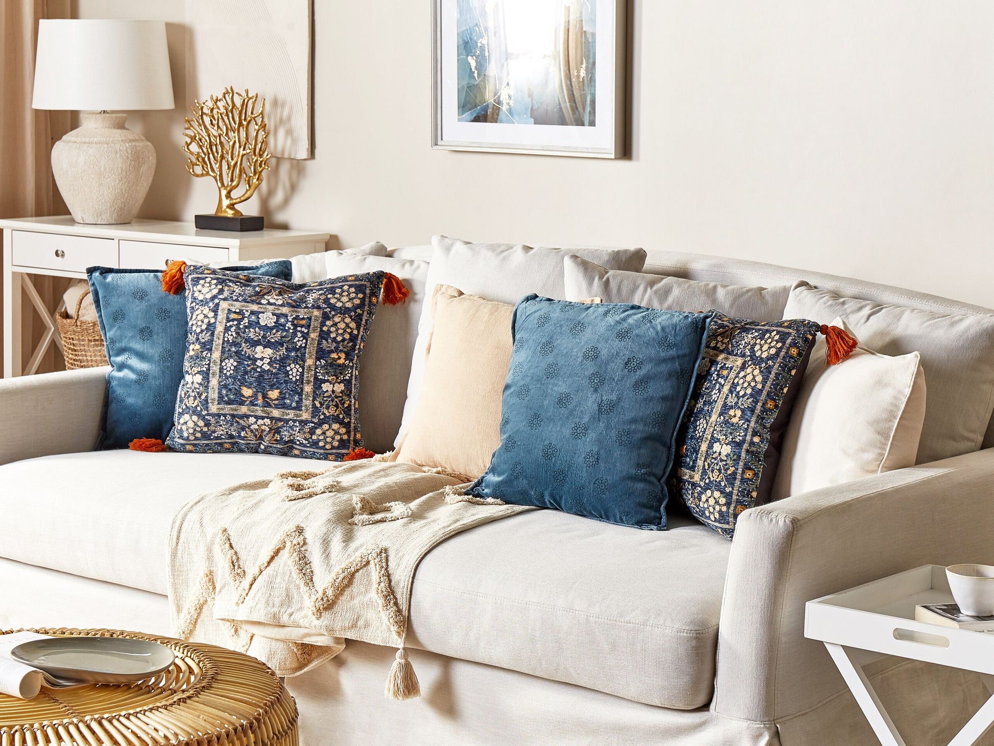 Sezen Sie auf dieses geschmeidige und weiche Sofakissen, das mit einem floralen Motiv versehen ist und einen wunderschönen Glanz auf Ihr Sofa, Bett oder Ihren Sessel bringt. Der Kissenbezug besteht aus hochwertiger Baumwolle, wobei die Vorderseite aus weichem Baumwollsamt gefertigt ist. Die orangen Quasten werden zusammen mit dem farbenreichen Pflanzenmotiv das Baumwollkissen zu einem Eyecacher auf jedem Sitzmöbel machen. Zudem ist die Kissenhülle mit einem praktischen Reissverschluss versehen, so gestaltet sich ihre Pflege unfassbar leicht. Material: Samtstoff. Zusätzliches Material: Baumwolle. Material Zusammensetzung: 100% Baumwolle Montage: Benötigt keine Montage Das Angebot beinhaltet: 1 x Zierkissen Höhe: 10 zusätzliche Information: Das Kissen ist vakuumverpackt. Nehmen Sie Ihr Kissen aus der Verpackung heraus und lassen Sie es 24 Stunden lang liegen, bis es seine volle Dichte erreicht., Bitte beachten Sie, dass Samtstoff unter verschiedenen Lichtverhältnissen eine andere Optik haben kann – das Material schimmert bei Tageslicht stärker und wirkt bei künstlicher Beleuchtung in Innenräumen eher gedämpft. Aufgrund der glatten, hochdichten Struktur des Gewebes kann sein Farbton auch variieren, wenn man mit der Hand in verschiedene Richtungen und Winkel über den Stoff fährt. Um den Farbton auszugleichen und Druckstellen zu vermeiden, sollte der Webstoff sanft mit einer offenen Handfläche in eine Richtung gestrichen, mit einem feuchten Tuch abgewischt oder einem Dampfbügeleisen gebügelt werden. Gestalten: Quadratisch Breite: 45 Tiefe: 45 Art: Dekokissen Stil: Retro Allgemeine Farbe: Bunt Muster: Blumenmuster Hauptmaterial: Samtstoff Füllmaterial: Polyester
