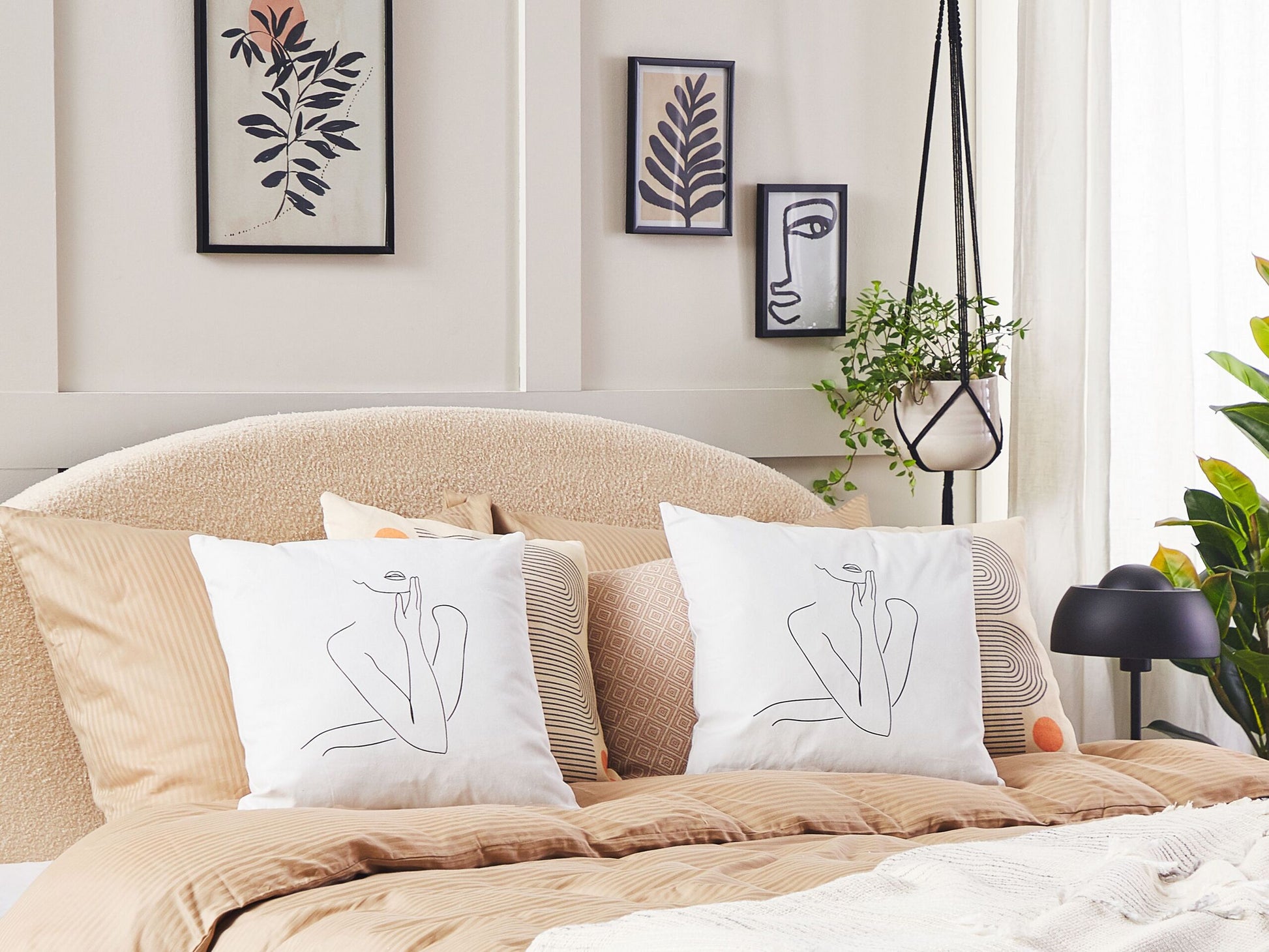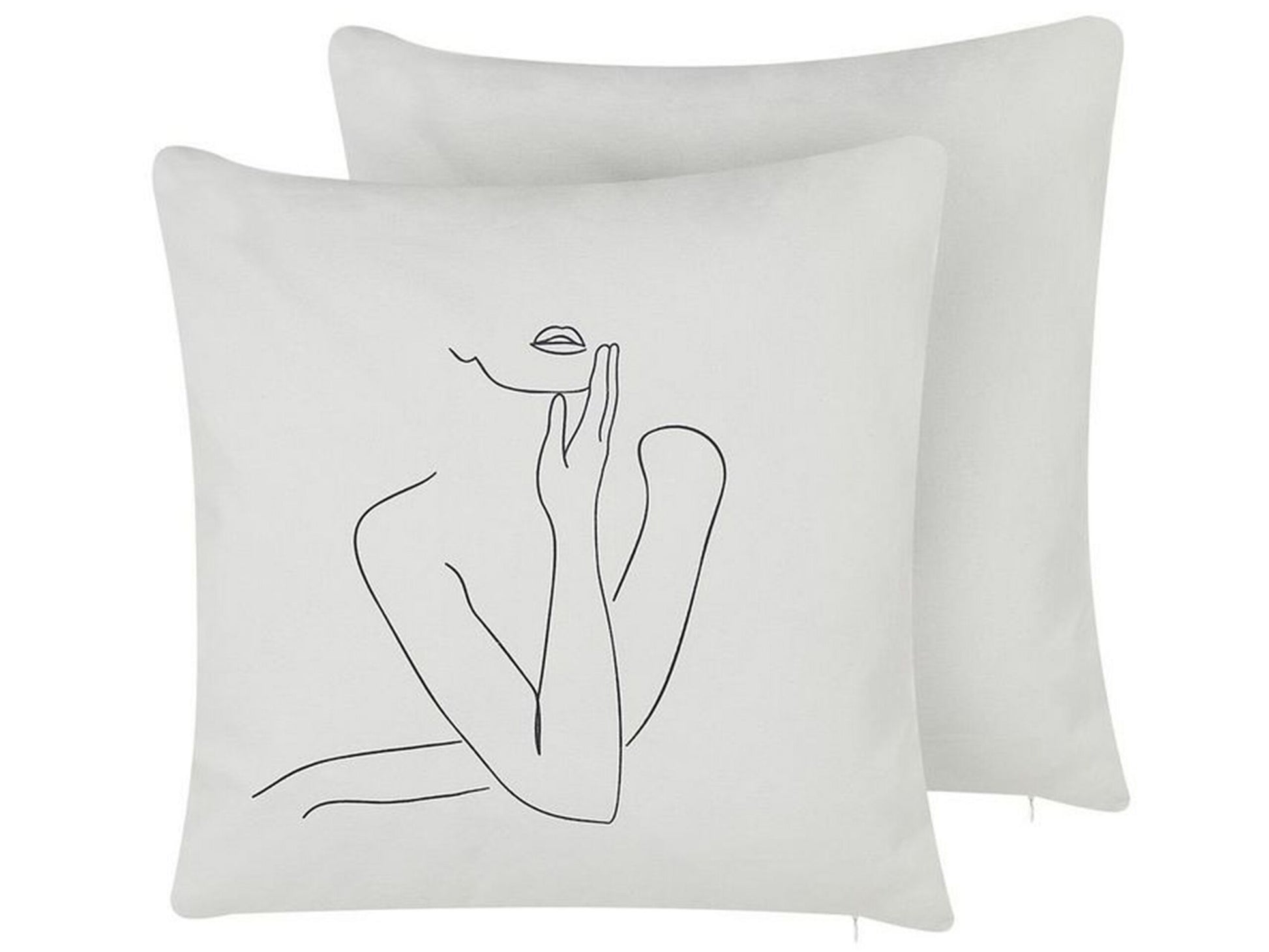 Ergänzen Sie Ihr Sofa oder Ihren Sessel mit diesem modernen Kissenset und setzen Sie damit einen markanten Akzent in Ihrem Wohnzimmer. Der trendige Druck zeigt eine schwarze Skizze der weiblichen Silhouette auf weissem Hintergrund. Dank der schlichten Farbgebung kann das Set leicht mit anderen Kissen kombiniert werden, um einen einzigartigen Look in Ihrem Zuhause zu erzielen. Die Zierkissen haben weiche Füllungen und abnehmbare Baumwollbezüge mit verdeckten Reissverschlüssen. Material: Baumwolle. Material Zusammensetzung: 100% Baumwolle Montage: Benötigt keine Montage Das Angebot beinhaltet: 2 x Zierkissen Höhe: 12 zusätzliche Information: Das Kissen ist vakuumverpackt. Nehmen Sie Ihr Kissen aus der Verpackung heraus und lassen Sie es 24 Stunden lang liegen, bis es seine volle Dichte erreicht. Gestalten: Quadratisch Breite: 45 Tiefe: 45 Art: Dekokissen 2er Set Stil: Modern Allgemeine Farbe: Weiss Muster: Abstraktes Muster Hauptmaterial: Baumwolle Füllmaterial: Polyester
