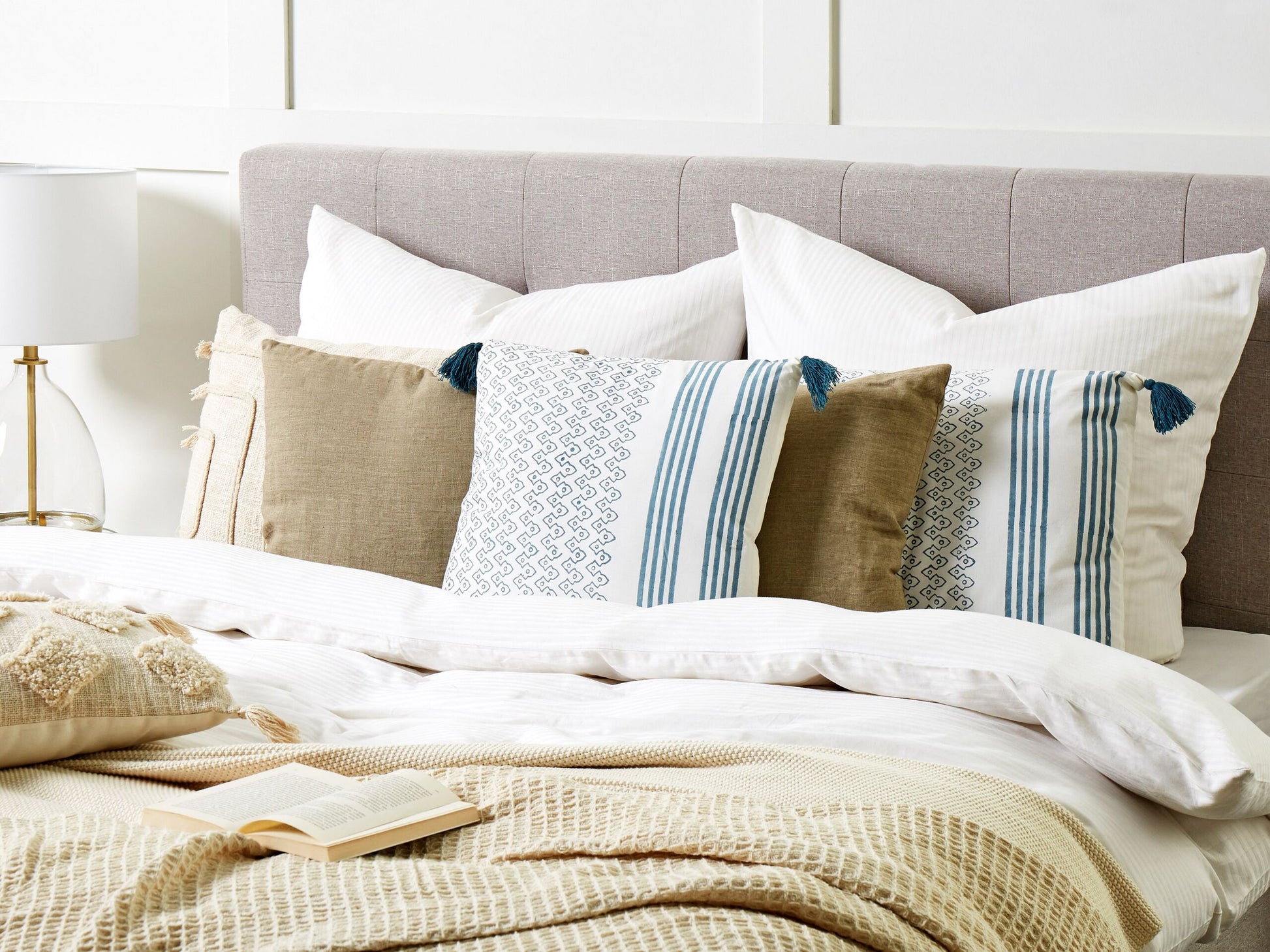 Setzen Sie mit diesem Kissen einen neuen Farbakzent in Ihrem Schlafzimmer. Das im Blockdruckverfahren hergestellte Kissen hat eine weisse Farbe und ist mit einem geometrischen Muster in Dunkelblau versehen, das es zu einem echten Blickfang macht. Zusätzlich ist das Kissen mit Fransen verziert, die den dekorativen Look vervollständigen. Es ist komplett aus Baumwolle gefertigt und eignet sich perfekt zum Entspannen auf der Couch oder im Bett. Material: Baumwolle. Material Zusammensetzung: 100% Baumwolle Montage: Benötigt keine Montage Das Angebot beinhaltet: 2 x Zierkissen Höhe: 10 zusätzliche Information: Das Kissen ist vakuumverpackt. Nehmen Sie Ihr Kissen aus der Verpackung heraus und lassen Sie es 24 Stunden lang liegen, bis es seine volle Dichte erreicht. Gestalten: Quadratisch Breite: 45 Tiefe: 45 Art: Dekokissen 2er Set Stil: Modern Allgemeine Farbe: Weiss Schatten: Dunkelblau Muster: Geometrisches Muster Hauptmaterial: Baumwolle Füllmaterial: Polyester