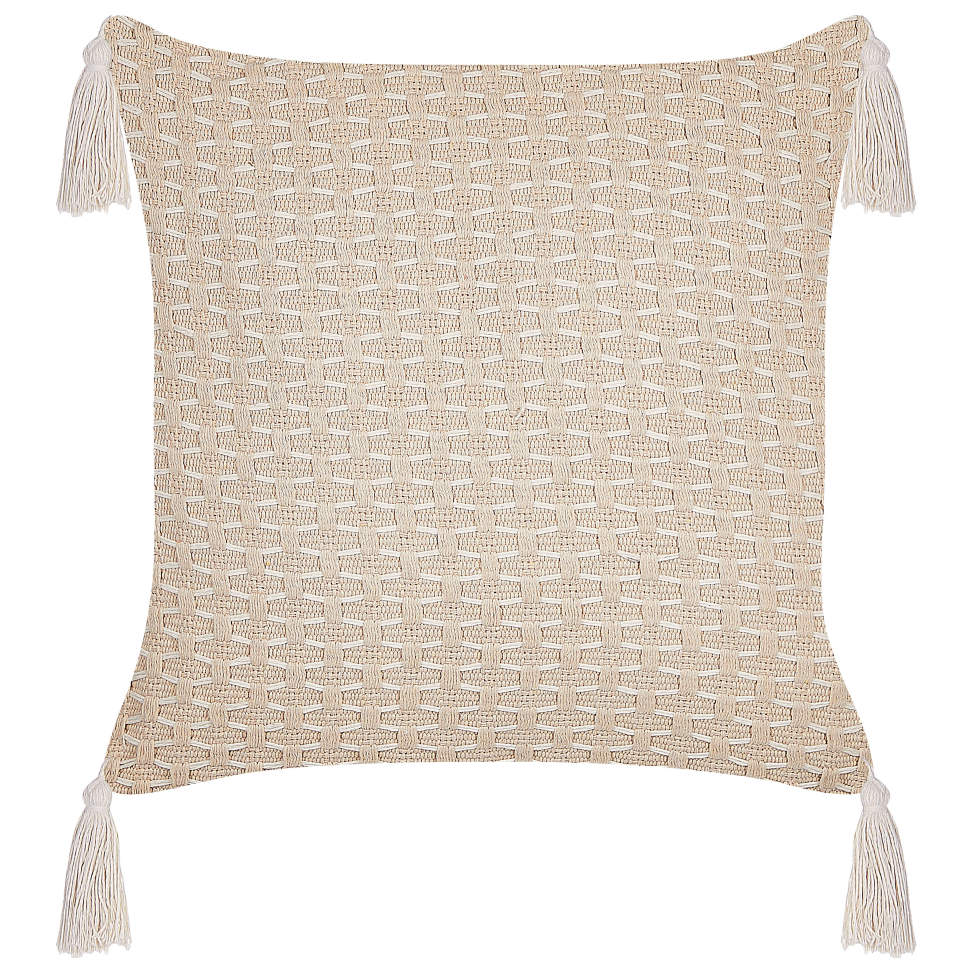 Mit diesem dekorativen Kissenset können Sie Ihr Wohnzimmer auffrischen und ihm eine gemütliche Note verleihen. Es besteht aus abnehmbaren Bezügen und hochwertigen Füllungen, die für einen dauerhaften Gebrauch sorgen. Jedes Kissen ist mit einem geometrischen Muster und Quasten versehen, die sowohl moderne als auch Boho-Einrichtungen und traditionelle Räume aufwerten. Material: Polyester. Zusätzliches Material: Baumwolle. Montage: Benötigt keine Montage Das Angebot beinhaltet: 2 x Zierkissen Höhe: 10 zusätzliche Information: Das Kissen ist vakuumverpackt. Nehmen Sie Ihr Kissen aus der Verpackung heraus und lassen Sie es 24 Stunden lang liegen, bis es seine volle Dichte erreicht. Gestalten: Quadratisch Breite: 42 Tiefe: 42 Art: Dekokissen 2er Set Stil: Boho Allgemeine Farbe: Beige Schatten: Hellbeige Muster: Geometrisches Muster Hauptmaterial: Polyester Füllmaterial: Polyester