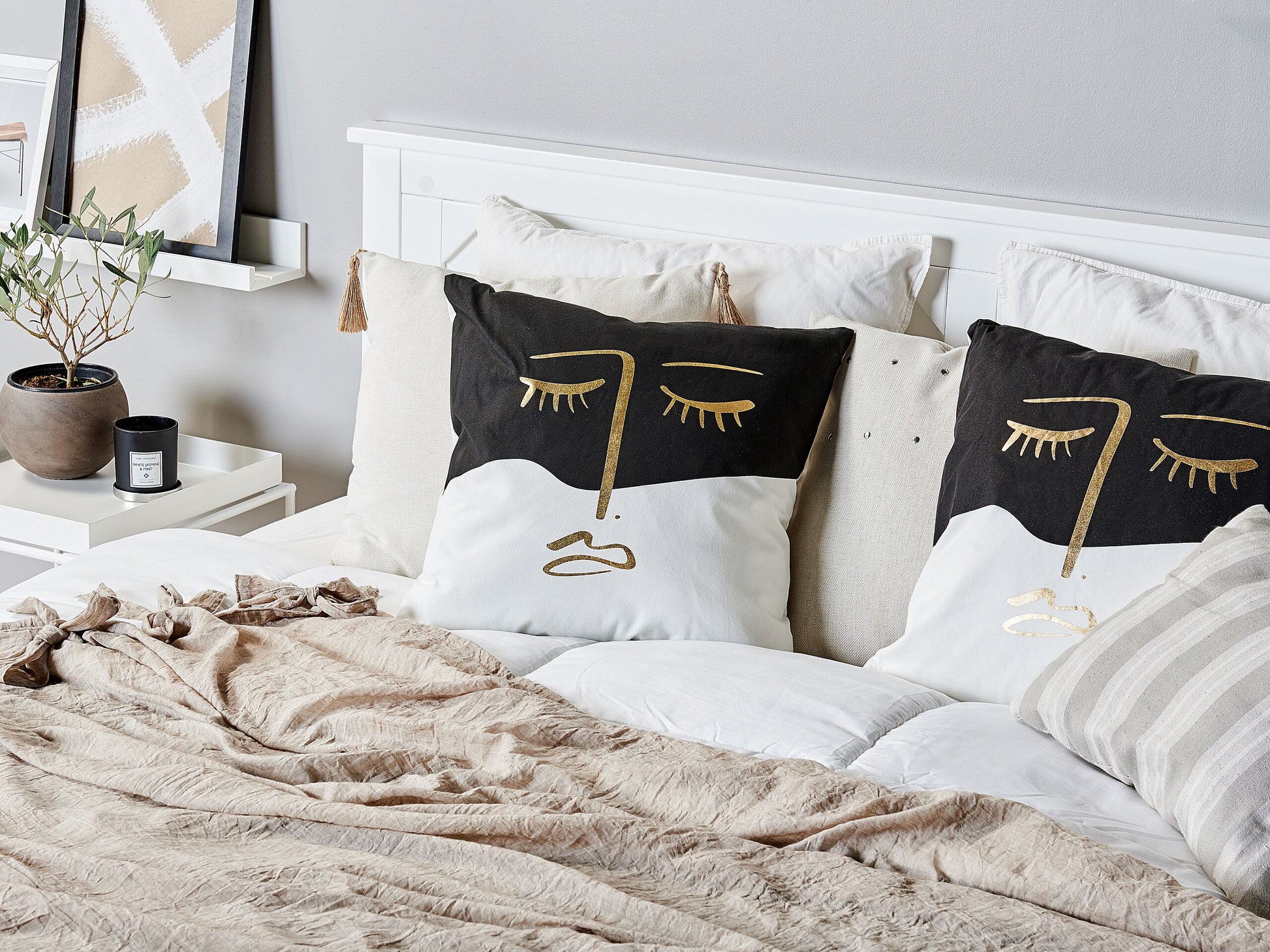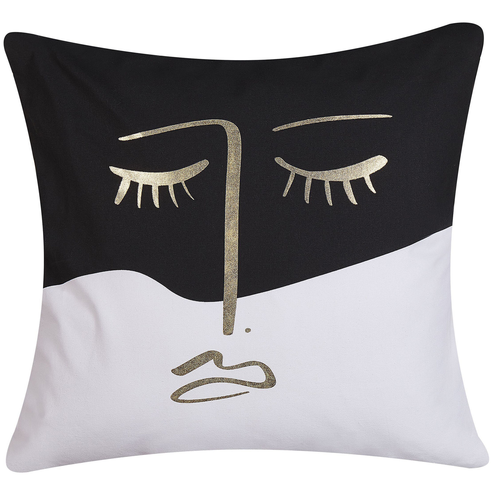 Suchen Sie nach einem dekorativen und sogleich gemütlichen Kissen, dass Ihnen wunderbare Träume beschert und ein ultimatives Entspannungsgefühl bietet? Mit diesem mondänen Accessoire ist der Dornröschenschlaf einfach vorprogrammiert. Die klassische Farbgebung in Schwarz und Weiss bekommt durch die Goldverzierungen einen glänzenden und glamourösen Touch, der zu allen modernen Einrichtungsstilen passt. Material: Baumwolle. Material Zusammensetzung: 100% Baumwolle Montage: Benötigt keine Montage Das Angebot beinhaltet: 2 x Zierkissen Höhe: 6 zusätzliche Information: Das Kissen ist vakuumverpackt. Nehmen Sie Ihr Kissen aus der Verpackung heraus und lassen Sie es 24 Stunden lang liegen, bis es seine volle Dichte erreicht. Gestalten: Quadratisch Breite: 45 Tiefe: 45 Art: Dekokissen 2er Set Stil: Modern Allgemeine Farbe: Weiss Muster: Abstraktes Muster Hauptmaterial: Baumwolle Füllmaterial: Polyester