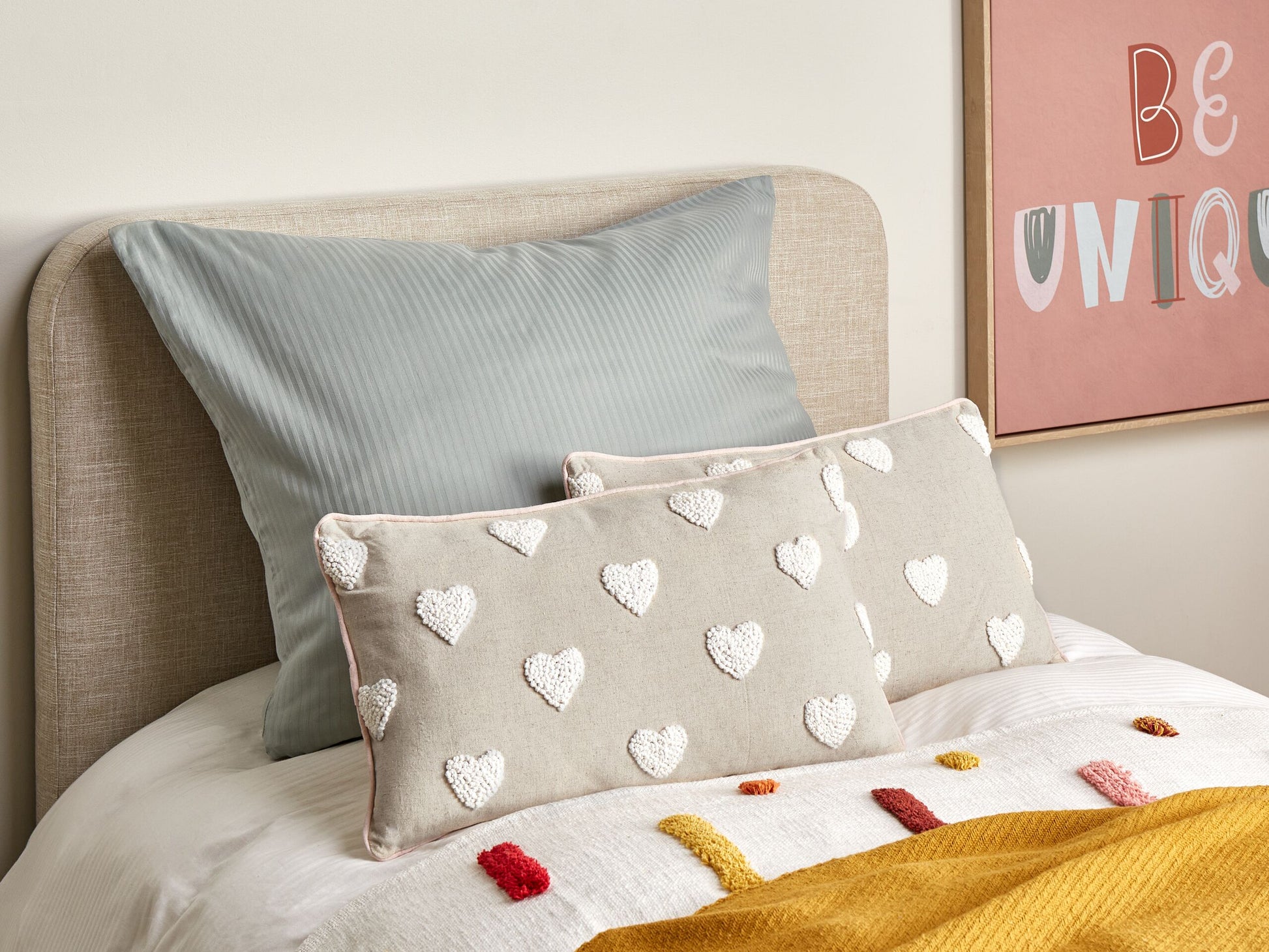 Diese Baumwollkissen mit ihrem bezaubernden, gestickten Herzchen-Muster kann man einfach nur lieben. Sie werden in jedem Raum eine behagliche Atmosphäre schaffen - egal ob im Kinderzimmer oder Wohnzimmer. Die plüschige Füllung sorgt für eine angenehme Weichheit, und dank des Reissverschlusses lassen sich die Bezüge für eine schnelle Reinigung ganz einfach abnehmen. Material: Baumwolle. Material Zusammensetzung: 100% Baumwolle Montage: Benötigt keine Montage Das Angebot beinhaltet: 2 x Zierkissen Höhe: 7 zusätzliche Information: Das Kissen ist vakuumverpackt. Nehmen Sie Ihr Kissen aus der Verpackung heraus und lassen Sie es 24 Stunden lang liegen, bis es seine volle Dichte erreicht., Jeder Artikel ist ein handgefertigtes Unikat; Farbschattierung und Muster können daher vom Foto abweichen. Gestalten: Rechteckig Breite: 30 Tiefe: 50 Art: Dekokissen 2er Set Stil: Retro Allgemeine Farbe: Beige Muster: Herzmotiv Hauptmaterial: Baumwolle Füllmaterial: Polyester