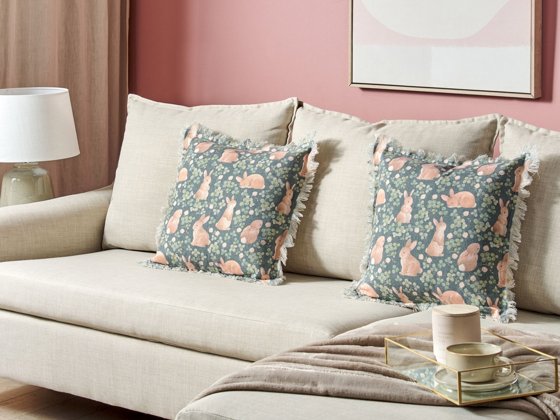 Diese Sofakissen bezaubern nicht nur mit ihren qualitativen Stoffen, sondern auch mit ihrer Verarbeitung und wunderschönem Kaninchenmotiv. Beide Kissenbezüge bestehen aus einem strapazierfähigen Polyester-Baumwoll-Gemisch und sind mit einer dicken Polyester-Füllung ausgestattet. Diese vortreffliche Materialwahl verleiht den Kissen eine angenehme Haptik und Weichheit sowie einen ansprechenden Look, der sich perfekt auf jedem Sofa oder Bett macht. Dank der integrierten, versteckten Reissverschlüsse gestaltet sich die Pflege des Sets sehr einfach. Zusätzlich zu dem verspielten Kaninchen-Aufdruck besitzen die Kissenhüllen dekorative Fransen an den Seiten, die den Charme Ihrer Einrichtung unterstreichen. Machen Sie sich sowie jedem Tierliebhaber, an den Sie das Kissen-Set verschenken, eine ganz besondere Freude. Material: Baumwolle. Material Zusammensetzung: 50 % Polyester, 50 % Baumwolle Montage: Benötigt keine Montage Das Angebot beinhaltet: 2 x Zierkissen Höhe: 4 zusätzliche Information: Das Kissen ist vakuumverpackt. Nehmen Sie Ihr Kissen aus der Verpackung heraus und lassen Sie es 24 Stunden lang liegen, bis es seine volle Dichte erreicht. Gestalten: Quadratisch Breite: 45 Tiefe: 45 Art: Dekokissen 2er Set Stil: Modern Allgemeine Farbe: Grün Muster: Tiermuster Hauptmaterial: Baumwolle Füllmaterial: Polyester