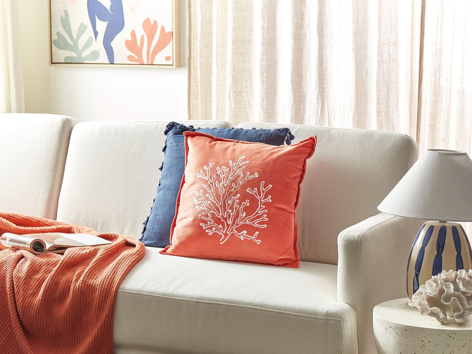 Beschreibung: Ergänzen Sie Ihre Wohnräume mit diesem weichen Samtkissen und geniessen Sie nicht nur ein zauberhaftes Urlaubsfeeling, sondern auch eine gemütliche Atmosphäre in Ihren vier Wänden. Die Vorderseite des Kissens ist aus geschmeidigem Baumwollsamt gefertigt und mit einer weissen Stickerei versehen, während seine Rückseite aus weicher Baumwolle in einer wunderschönen Leinenoptik besteht. Die farblich auf das Kissen abgestimmte Biese ist ein weiteres niedliches Detail, das die hochwertige Verarbeitung und den kuscheligen Look des Dekokissens hervorhebt. Der abnehmbare Bezug erleichtert die tägliche Pflege, während das moderne Korallen-Design perfekt zu jeder Einrichtung passt. Material: Samtstoff. Material Zusammensetzung: 100% Baumwolle Montage: Benötigt keine Montage Das Angebot beinhaltet: 1 x Zierkissen Höhe: 10 zusätzliche Information: Das Kissen ist vakuumverpackt. Nehmen Sie Ihr Kissen aus der Verpackung heraus und lassen Sie es 24 Stunden lang liegen, bis es seine volle Dichte erreicht., Bitte beachten Sie, dass Samtstoff unter verschiedenen Lichtverhältnissen eine andere Optik haben kann – das Material schimmert bei Tageslicht stärker und wirkt bei künstlicher Beleuchtung in Innenräumen eher gedämpft. Aufgrund der glatten, hochdichten Struktur des Gewebes kann sein Farbton auch variieren, wenn man mit der Hand in verschiedene Richtungen und Winkel über den Stoff fährt. Um den Farbton auszugleichen und Druckstellen zu vermeiden, sollte der Webstoff sanft mit einer offenen Handfläche in eine Richtung gestrichen, mit einem feuchten Tuch abgewischt oder einem Dampfbügeleisen gebügelt werden. Gestalten: Quadratisch Breite: 45 Tiefe: 45 Art: Dekokissen Stil: Modern Allgemeine Farbe: Rot Schatten: Korallenrot Muster: Pflanzenmuster Hauptmaterial: Samtstoff Füllmaterial: Polyester
