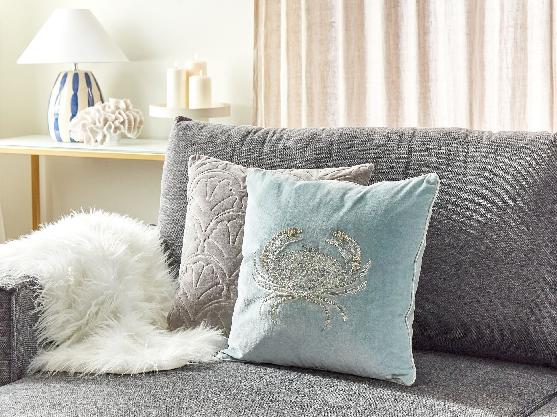 Holen Sie mehr aus Ihrem Schlaf- oder Wohnbereich und ergänzen Sie Ihre Möbel mit diesem angenehm weichen Samtkissen. Mit seinem modernen Krabbenmotiv bringt es das Küstenfeeling direkt zu Ihnen nach Hause und zaubert dabei wohlige Gemütlichkeit auf Ihr Bett, Sofa oder Ihren Sessel. Die Vorderseite des Kissens ist aus geschmeidigem Baumwollsamt gefertigt, während seine Rückseite aus weichen Baumwollfasern in einer wunderschönen Leinenoptik besteht. Der silberfarbene Foliendruck sorgt für einen auffallenden Metallic-Effekt und wird mit zusätzlichen Perlen besetzt, die seine prachtvolle Optik noch weiter hervorheben. Die Biese ist ein weiteres niedliches Detail, das sowohl eins mit dem Design wird, als auch die hochwertige Verarbeitung des Dekokissens unterstützt.  Material: Samtstoff. Material Zusammensetzung: 100% Baumwolle Montage: Benötigt keine Montage Das Angebot beinhaltet: 1 x Zierkissen Höhe: 10 zusätzliche Information: Das Kissen ist vakuumverpackt. Nehmen Sie Ihr Kissen aus der Verpackung heraus und lassen Sie es 24 Stunden lang liegen, bis es seine volle Dichte erreicht., Bitte beachten Sie, dass Samtstoff unter verschiedenen Lichtverhältnissen eine andere Optik haben kann – das Material schimmert bei Tageslicht stärker und wirkt bei künstlicher Beleuchtung in Innenräumen eher gedämpft. Aufgrund der glatten, hochdichten Struktur des Gewebes kann sein Farbton auch variieren, wenn man mit der Hand in verschiedene Richtungen und Winkel über den Stoff fährt. Um den Farbton auszugleichen und Druckstellen zu vermeiden, sollte der Webstoff sanft mit einer offenen Handfläche in eine Richtung gestrichen, mit einem feuchten Tuch abgewischt oder einem Dampfbügeleisen gebügelt werden. Gestalten: Quadratisch Breite: 45 Tiefe: 45 Art: Dekokissen Stil: Modern Allgemeine Farbe: Blau Schatten: Hellblau Muster: Tiermuster Hauptmaterial: Samtstoff Füllmaterial: Polyester