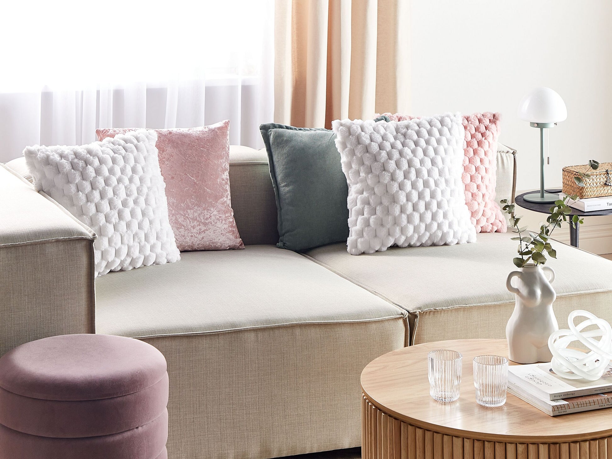 Bringen Sie mit diesem Kissenset zusätzliche Gemütlichkeit und Komfort in Ihren Wohnbereich. Die Vorderseite besteht aus flauschigem Kunstfell mit Wabenmuster, während die Rückseite eine elegante einfarbige und samtige Struktur aufweist. Dank der weichen Füllung eignen sich die Kissen perfekt für ein Nachmittagsschläfchen oder zum Entspannen auf dem Sofa. Material: Webpelz. Zusätzliches Material: Samtstoff. Material Zusammensetzung: 100% Polyester Montage: Benötigt keine Montage Das Angebot beinhaltet: 2 x Zierkissen Höhe: 10 zusätzliche Information: Das Kissen ist vakuumverpackt. Nehmen Sie Ihr Kissen aus der Verpackung heraus und lassen Sie es 24 Stunden lang liegen, bis es seine volle Dichte erreicht., Bitte beachten Sie, dass Samtstoff unter verschiedenen Lichtverhältnissen eine andere Optik haben kann – das Material schimmert bei Tageslicht stärker und wirkt bei künstlicher Beleuchtung in Innenräumen eher gedämpft. Aufgrund der glatten, hochdichten Struktur des Gewebes kann sein Farbton auch variieren, wenn man mit der Hand in verschiedene Richtungen und Winkel über den Stoff fährt. Um den Farbton auszugleichen und Druckstellen zu vermeiden, sollte der Webstoff sanft mit einer offenen Handfläche in eine Richtung gestrichen, mit einem feuchten Tuch abgewischt oder einem Dampfbügeleisen gebügelt werden. Gestalten: Quadratisch Breite: 43 Tiefe: 43 Art: Dekokissen 2er Set Stil: Boho Allgemeine Farbe: Weiss Schatten: Cremeweiss Muster: Geometrisches Muster Hauptmaterial: Webpelz Füllmaterial: Polyester