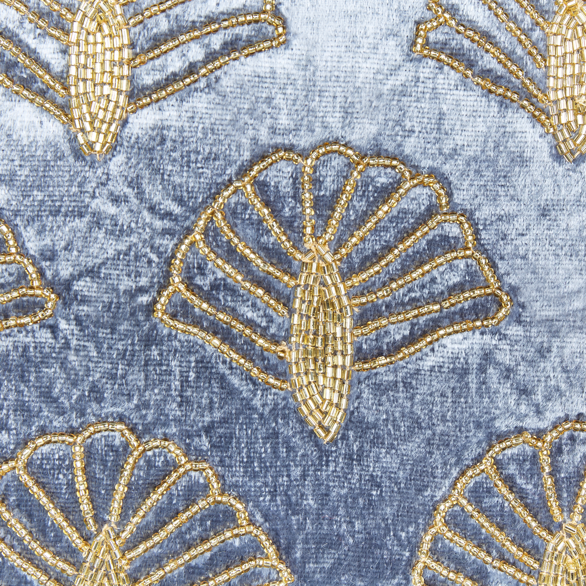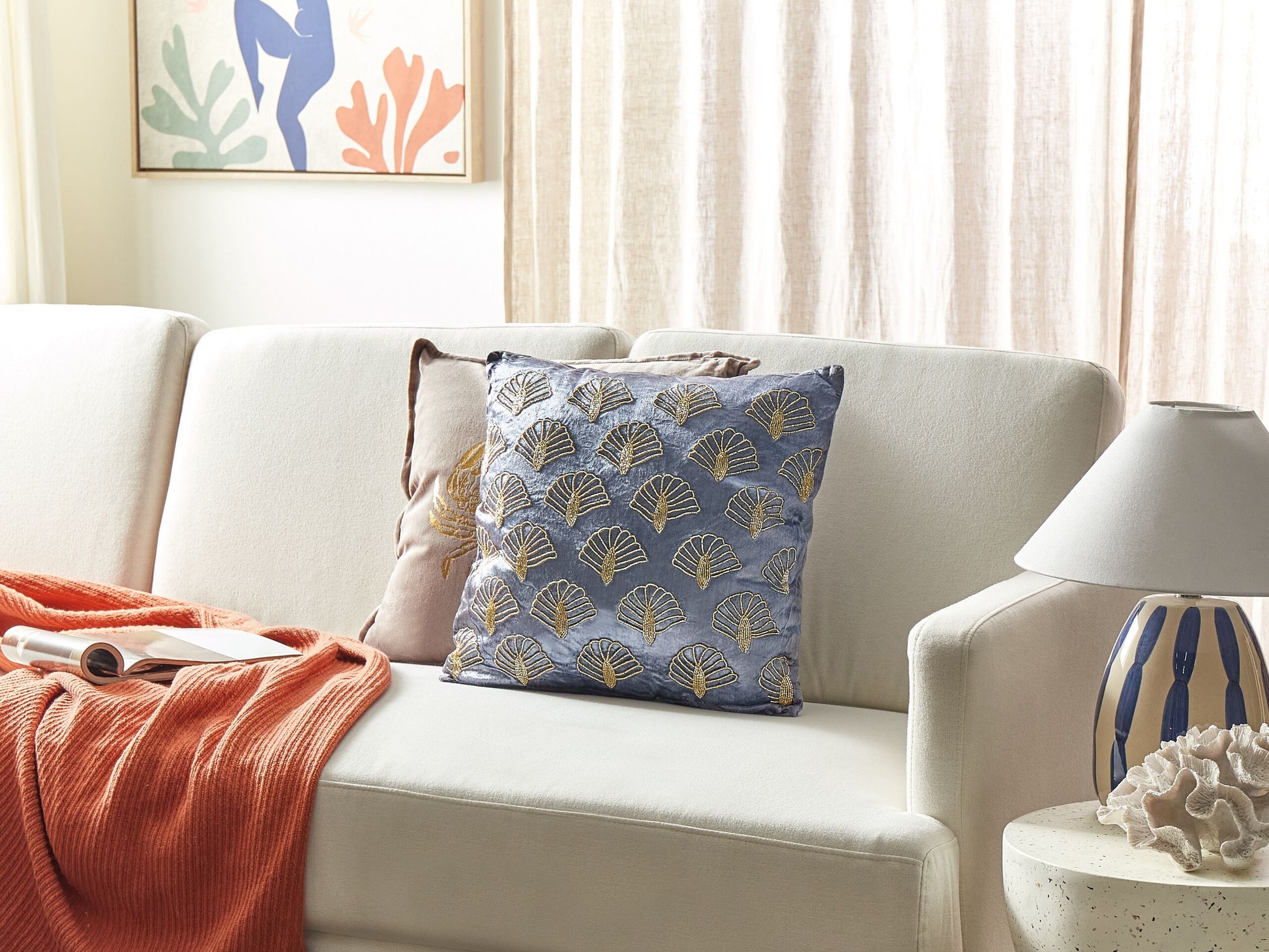 Dieses quadratische Kissen wird Ihren Wohnraum mit einem maritimen Flair aufwerten. Das aus hochwertigem Samt handgefertigte Kissen fühlt sich angenehm weich an und ist mit einer dicken Füllung ausgestattet. Es zeichnet sich durch eine zeitlose, glamouröse Farbkombination aus, bei der ein violettfarbener Hintergrund mit einem goldfarbenen, gestickten Muschelmuster kombiniert wurde. Das Dekokissen ist zudem dank des Reissverschlusses pflegeleicht und einfach zu reinigen. Material: Samtstoff. Zusätzliches Material: Baumwolle. Montage: Benötigt keine Montage Das Angebot beinhaltet: 1 x Zierkissen Höhe: 10 zusätzliche Information: Das Kissen ist vakuumverpackt. Nehmen Sie Ihr Kissen aus der Verpackung heraus und lassen Sie es 24 Stunden lang liegen, bis es seine volle Dichte erreicht., Da jedes Produkt handgefertigt wird, kann es zu kleineren Abweichungen in der Farbe und der äusseren Struktur kommen. Diese Abweichungen stellen keinen Qualitätsmangel dar, sondern sind eine warentypische Eigenschaft., Bitte beachten Sie, dass Samtstoff unter verschiedenen Lichtverhältnissen eine andere Optik haben kann – das Material schimmert bei Tageslicht stärker und wirkt bei künstlicher Beleuchtung in Innenräumen eher gedämpft. Aufgrund der glatten, hochdichten Struktur des Gewebes kann sein Farbton auch variieren, wenn man mit der Hand in verschiedene Richtungen und Winkel über den Stoff fährt. Um den Farbton auszugleichen und Druckstellen zu vermeiden, sollte der Webstoff sanft mit einer offenen Handfläche in eine Richtung gestrichen, mit einem feuchten Tuch abgewischt oder einem Dampfbügeleisen gebügelt werden. Gestalten: Quadratisch Breite: 45 Tiefe: 45 Art: Dekokissen Stil: Boho Allgemeine Farbe: Gold Muster: Geometrisches Muster Hauptmaterial: Samtstoff Füllmaterial: Polyester