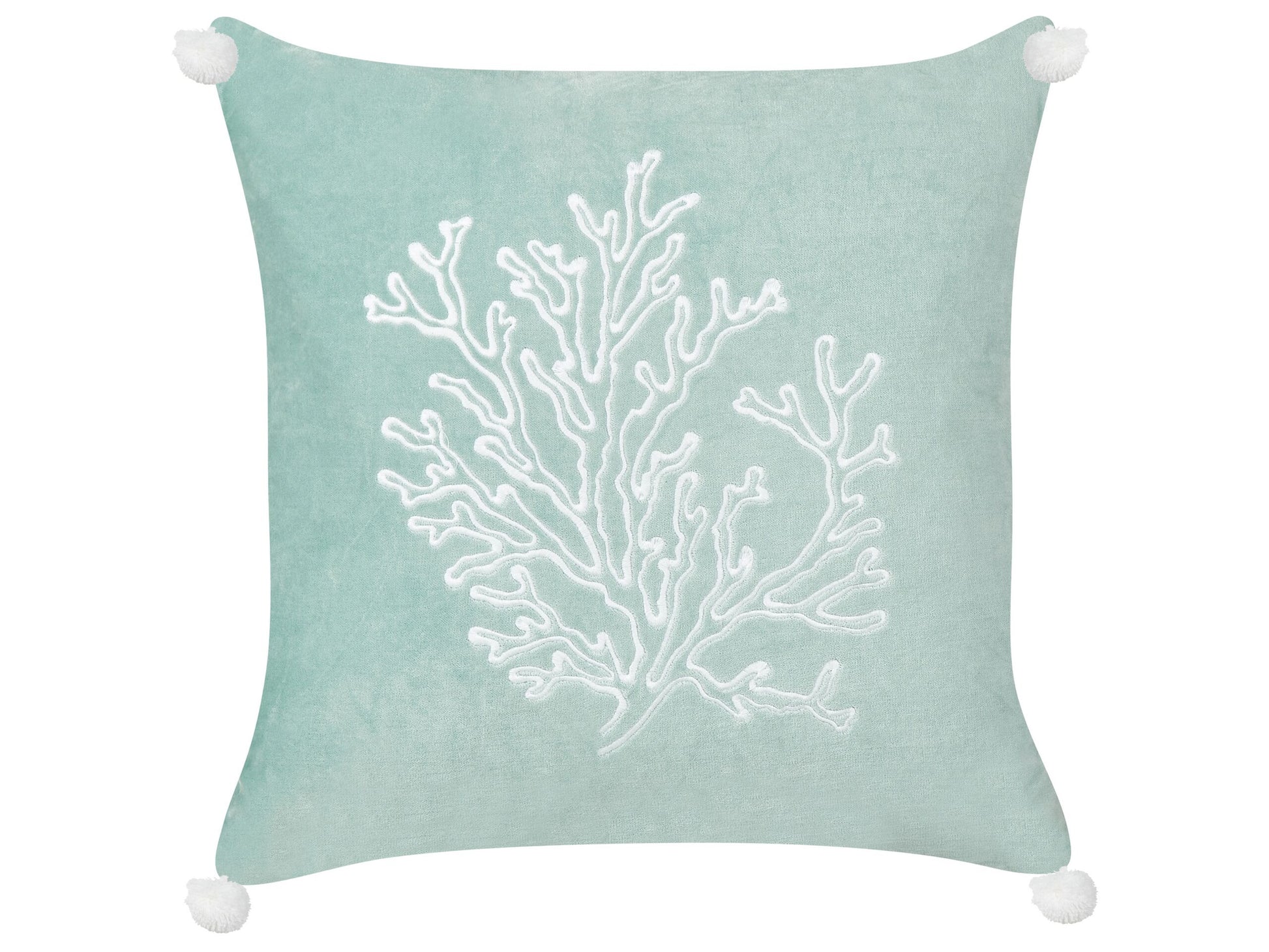 Ergänzen Sie Ihre Wohnräume mit diesem weichen Samtkissen und geniessen Sie nicht nur ein zauberhaftes Urlaubsfeeling, sondern auch eine gemütliche Atmosphäre in Ihren vier Wänden. Die Vorderseite des Kissens ist aus geschmeidigem Baumwollsamt gefertigt und mit einer weissen Stickerei versehen, während seine Rückseite aus weicher Baumwolle in einer wunderschönen Leinenoptik besteht. Die weissen Bommeln und die farblich auf das Kissen abgestimmte Biese sind weitere niedliche Details, die die hochwertige Verarbeitung und den kuscheligen Look des Dekokissens hervorheben. Der abnehmbare Bezug erleichtert die tägliche Pflege, während das moderne Korallen-Design perfekt zu jeder Einrichtung passt.  Material: Samtstoff. Material Zusammensetzung: 100% Baumwolle Montage: Benötigt keine Montage Das Angebot beinhaltet: 1 x Zierkissen Höhe: 10 zusätzliche Information: Das Kissen ist vakuumverpackt. Nehmen Sie Ihr Kissen aus der Verpackung heraus und lassen Sie es 24 Stunden lang liegen, bis es seine volle Dichte erreicht., Bitte beachten Sie, dass Samtstoff unter verschiedenen Lichtverhältnissen eine andere Optik haben kann – das Material schimmert bei Tageslicht stärker und wirkt bei künstlicher Beleuchtung in Innenräumen eher gedämpft. Aufgrund der glatten, hochdichten Struktur des Gewebes kann sein Farbton auch variieren, wenn man mit der Hand in verschiedene Richtungen und Winkel über den Stoff fährt. Um den Farbton auszugleichen und Druckstellen zu vermeiden, sollte der Webstoff sanft mit einer offenen Handfläche in eine Richtung gestrichen, mit einem feuchten Tuch abgewischt oder einem Dampfbügeleisen gebügelt werden. Gestalten: Quadratisch Breite: 45 Tiefe: 45 Art: Dekokissen Stil: Modern Allgemeine Farbe: Grün Schatten: Mintgrün Muster: Pflanzenmuster Hauptmaterial: Samtstoff Füllmaterial: Polyester