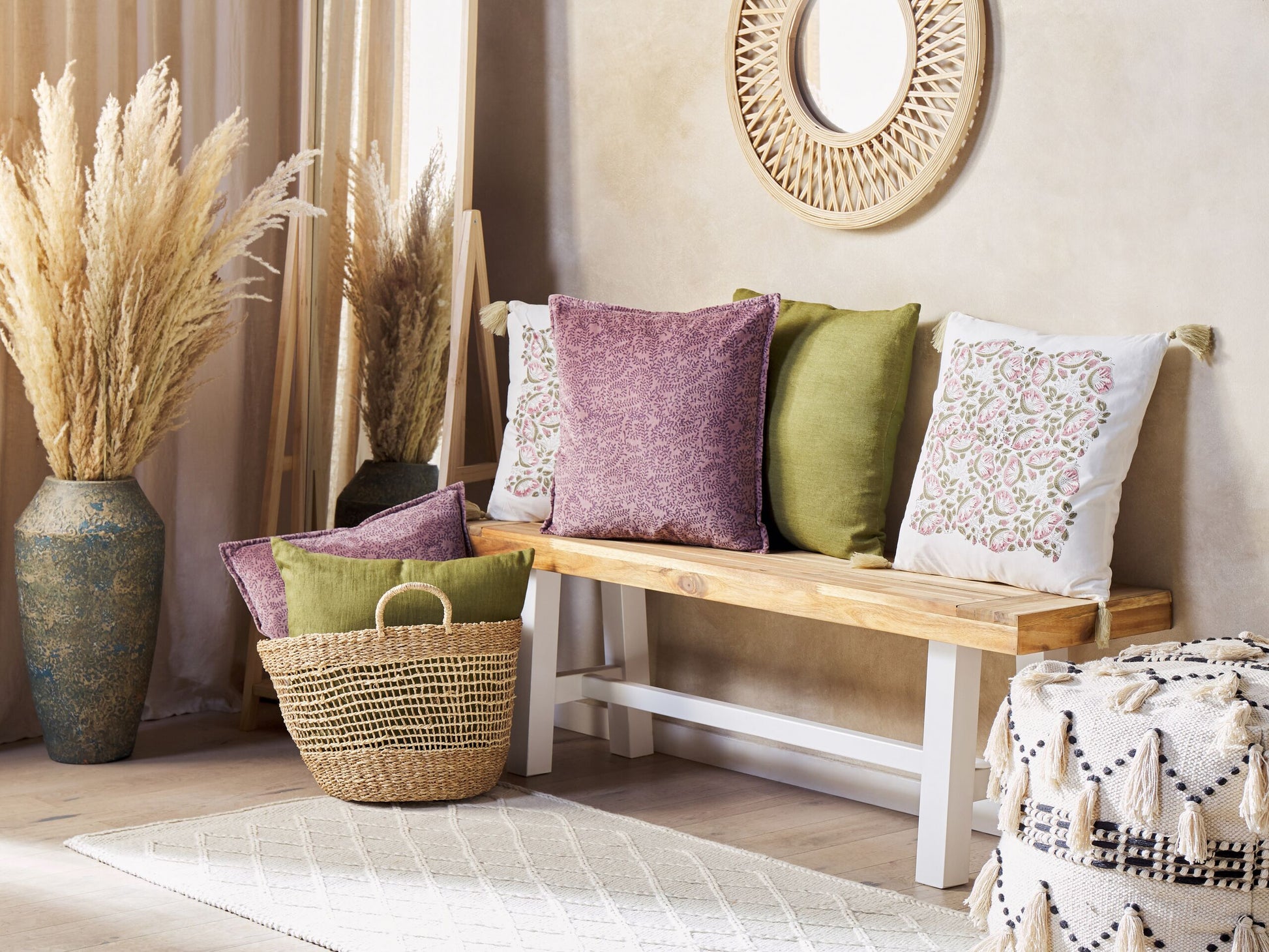 Diese quadratischen Boho-Kissen werden sich in Ihrem Schlafzimmer wundervoll beweisen, vor allem, wenn Sie diese mit anderen Textilein mit Blumenmotiven kombinieren. Die Vorderseite der Sofakissen ist aus hochwertigem Samt gefertigt, so fühlen sie sich sehr geschmeidig an und sind dabei auch besonders langlebig. Dank der versteckten Reissverschlüsse auf den Rückseiten der Kissen sind die Bezüge auch einfach zu reinigen. Die Rückseiten der Kissenhüllen bestehen aus strapazierfähiger Baumwolle. Die Stoffkissen punkten mit einem angesagten Look, einer wunderschönen Verarbeitung, weichen Materialien sowie einem handgefertigten Blockdruckmuster auf der Vorderseite. Material: Samtstoff. Zusätzliches Material: Baumwolle. Material Zusammensetzung: 100% Baumwolle Montage: Benötigt keine Montage Das Angebot beinhaltet: 2 x Zierkissen Höhe: 10 zusätzliche Information: Das Kissen ist vakuumverpackt. Nehmen Sie Ihr Kissen aus der Verpackung heraus und lassen Sie es 24 Stunden lang liegen, bis es seine volle Dichte erreicht., Bitte beachten Sie, dass Samtstoff unter verschiedenen Lichtverhältnissen eine andere Optik haben kann – das Material schimmert bei Tageslicht stärker und wirkt bei künstlicher Beleuchtung in Innenräumen eher gedämpft. Aufgrund der glatten, hochdichten Struktur des Gewebes kann sein Farbton auch variieren, wenn man mit der Hand in verschiedene Richtungen und Winkel über den Stoff fährt. Um den Farbton auszugleichen und Druckstellen zu vermeiden, sollte der Webstoff sanft mit einer offenen Handfläche in eine Richtung gestrichen, mit einem feuchten Tuch abgewischt oder einem Dampfbügeleisen gebügelt werden. Gestalten: Quadratisch Breite: 45 Tiefe: 45 Art: Dekokissen 2er Set Stil: Boho Allgemeine Farbe: Rosa Muster: Blumenmuster Hauptmaterial: Samtstoff Füllmaterial: Polyester