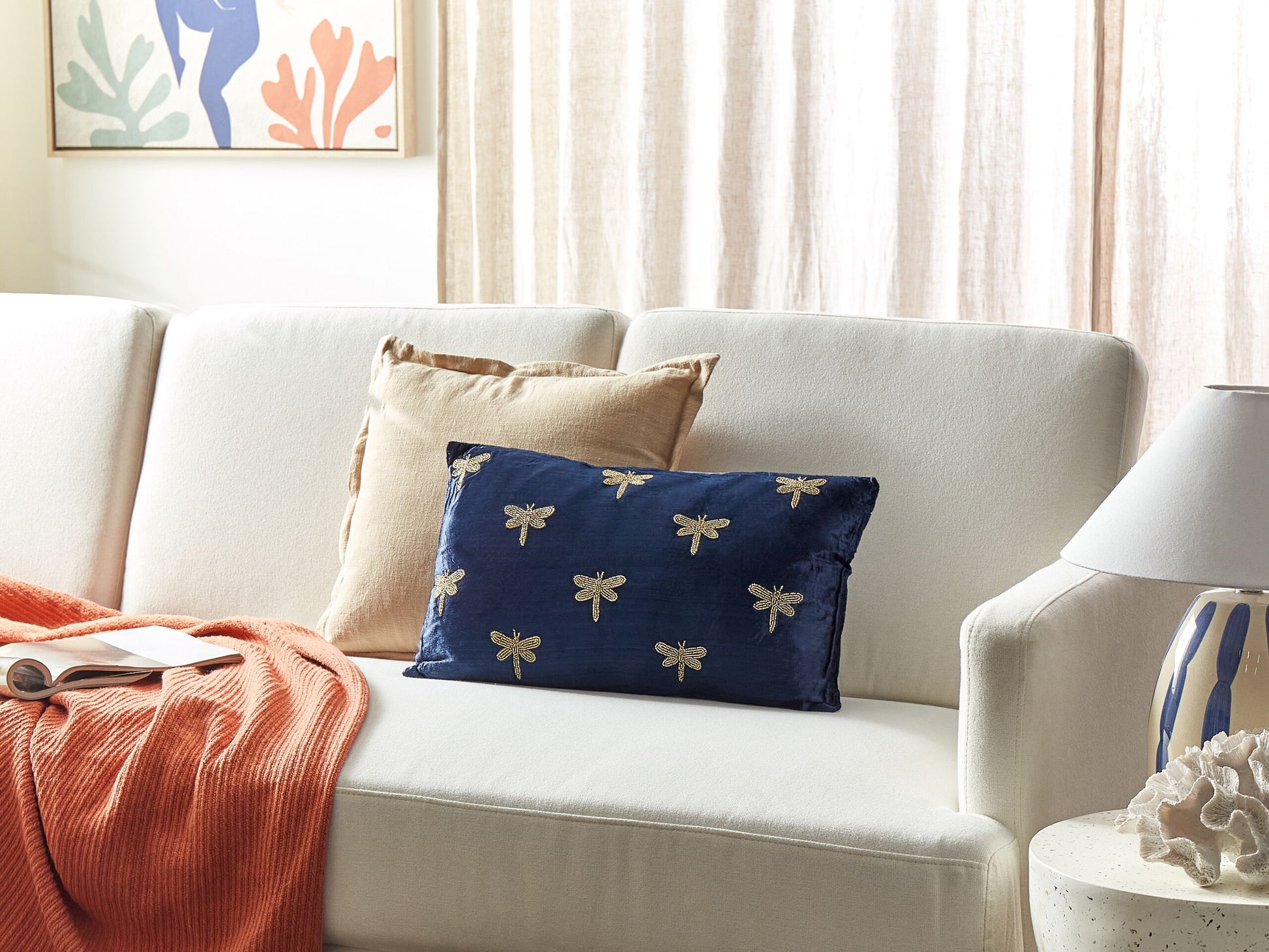Verschönern Sie Ihren Wohnbereich mit diesem bezaubernden Streukissen. Das handgefertigte Schmuckstück besticht durch seine satte, tiefe Farbe, die Raffinesse ausstrahlt. Das aufwendig gestickte Libellenmotiv tanzt über den prächtigen Samt und verleiht ihm einen Hauch von ätherischer Eleganz. Praktisch und luxuriös durch einen abnehmbaren Bezug und nahtlos integrierten Reissverschluss - ein optischer Blickfang und ein funktionales Meisterwerk für Ihr Zuhause. Material: Samtstoff. Zusätzliches Material: Baumwolle. Material Zusammensetzung: 50% Viskose, 50 % Baumwolle Montage: Benötigt keine Montage Das Angebot beinhaltet: 1 x Zierkissen Höhe: 6 zusätzliche Information: Das Kissen ist vakuumverpackt. Nehmen Sie Ihr Kissen aus der Verpackung heraus und lassen Sie es 24 Stunden lang liegen, bis es seine volle Dichte erreicht., Bitte beachten Sie, dass Samtstoff unter verschiedenen Lichtverhältnissen eine andere Optik haben kann – das Material schimmert bei Tageslicht stärker und wirkt bei künstlicher Beleuchtung in Innenräumen eher gedämpft. Aufgrund der glatten, hochdichten Struktur des Gewebes kann sein Farbton auch variieren, wenn man mit der Hand in verschiedene Richtungen und Winkel über den Stoff fährt. Um den Farbton auszugleichen und Druckstellen zu vermeiden, sollte der Webstoff sanft mit einer offenen Handfläche in eine Richtung gestrichen, mit einem feuchten Tuch abgewischt oder einem Dampfbügeleisen gebügelt werden., Da jedes Produkt handgefertigt wird, kann es zu kleineren Abweichungen in der Farbe und der äusseren Struktur kommen. Diese Abweichungen stellen keinen Qualitätsmangel dar, sondern sind eine warentypische Eigenschaft. Gestalten: Rechteckig Breite: 50 Tiefe: 30 Art: Dekokissen Stil: Modern Allgemeine Farbe: Blau Schatten: Marineblau Muster: Tiermuster Hauptmaterial: Samtstoff Füllmaterial: Polyester