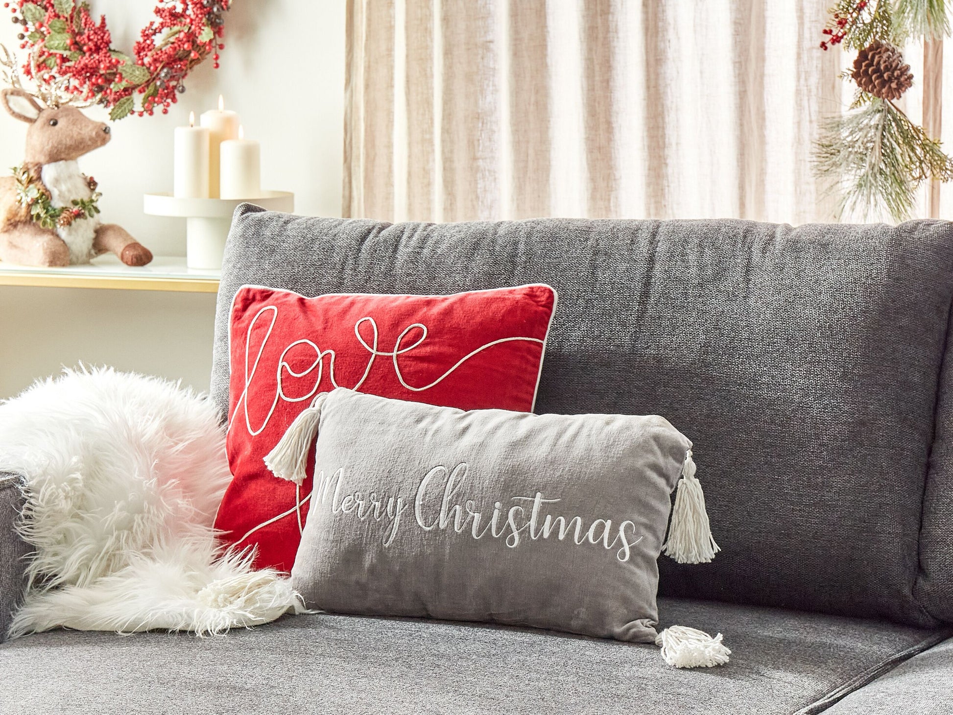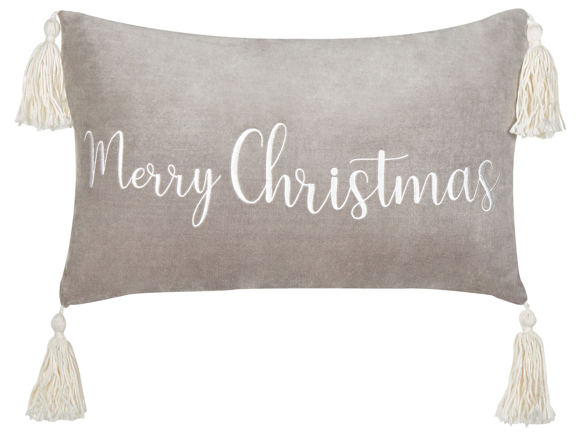 Mit diesem charmanten Zierkissen setzen Sie einen weihnachtlichen Akzent in Ihren Wohnbereichen. Das Kissen ist mit einer weichen Polyester-Füllung versehen und verfügt über einen abnehmbaren Bezug aus geschmeidigem Baumwollsamt. So ist die Kissenhüll sowohl langlebig als auch angenehm weich und pflegeleicht. Die Kissen-Vorderseite ist mit einem weissen Schriftzug bestickt und an den Seiten mit Quasten aufgeppept. Dank seiner gemütlichen Ausstrahlung ist das Kissen eine grossartige Ergänzung für jeden Wohnstil. Material: Samtstoff. Material Zusammensetzung: 100% Baumwolle Montage: Benötigt keine Montage Das Angebot beinhaltet: 1 x Zierkissen Höhe: 10 zusätzliche Information: Bitte beachten Sie, dass Samtstoff unter verschiedenen Lichtverhältnissen eine andere Optik haben kann – das Material schimmert bei Tageslicht stärker und wirkt bei künstlicher Beleuchtung in Innenräumen eher gedämpft. Aufgrund der glatten, hochdichten Struktur des Gewebes kann sein Farbton auch variieren, wenn man mit der Hand in verschiedene Richtungen und Winkel über den Stoff fährt. Um den Farbton auszugleichen und Druckstellen zu vermeiden, sollte der Webstoff sanft mit einer offenen Handfläche in eine Richtung gestrichen, mit einem feuchten Tuch abgewischt oder einem Dampfbügeleisen gebügelt werden., Da jedes Produkt handgefertigt wird, kann es zu kleineren Abweichungen in der Farbe und der äusseren Struktur kommen. Diese Abweichungen stellen keinen Qualitätsmangel dar, sondern sind eine warentypische Eigenschaft. Gestalten: Rechteckig Breite: 50 Tiefe: 30 Art: Dekokissen Stil: Modern Allgemeine Farbe: Grau Muster: Kein Muster Hauptmaterial: Samtstoff Füllmaterial: Polyester