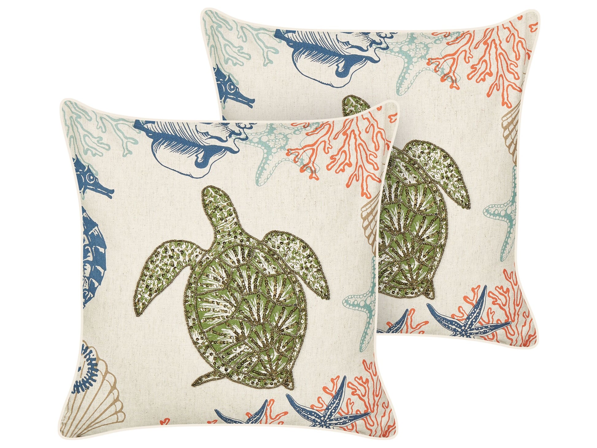 Dieses Sofakissen 2er Set zaubert einen geheimnisvollen Küstencharme in Ihre vier Wände, während die weiche Leinenstruktur und die weiche Polyesterfüllung einen unvergleichlichen Komfort bieten. Die aufgedruckten Motive bestehen aus verschiedenen Meerestieren und -pflanzen, wie Schildkröten, Muscheln, Korallen, Seepferden und -sternen. Dabei sind die maritimen Muster in auffallenden Farbtönen gehalten und zusätzlich sowohl mit Perlen als auch Pailletten besetzt. Durch die zusätzlichen Reissverschlüsse wird die Pflegeleichtigkeit der Bezüge gewährleistet und Sie können die Hülle bei Bedarf gegen eine andere austauschen. Diese Zierkissen sind nicht nur eine perfekte Ergänzung Ihrer Sitz- oder Schlafmöbel, sondern auch ein hervorragendes Geschenk für jeden Naturliebhaber. Material: Leinen. Montage: Benötigt keine Montage Das Angebot beinhaltet: 2 x Zierkissen Höhe: 10 zusätzliche Information: Das Kissen ist vakuumverpackt. Nehmen Sie Ihr Kissen aus der Verpackung heraus und lassen Sie es 24 Stunden lang liegen, bis es seine volle Dichte erreicht. Gestalten: Quadratisch Breite: 45 Tiefe: 45 Art: Dekokissen 2er Set Stil: Modern Allgemeine Farbe: Beige Muster: Tiermuster Hauptmaterial: Leinen Füllmaterial: Polyester