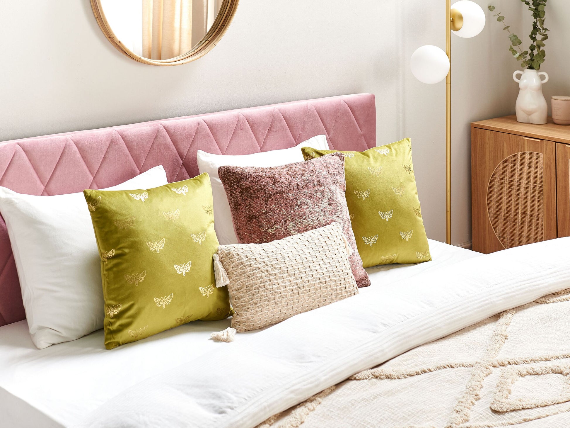 Verleihen Sie Ihrem Zuhause mit diesem Kissen-Set einen eleganten und gemütlichen Look. Die Bezüge sind aus Samt gefertigt und mit einem Foliendruck verziert. Die Kissen haben eine weiche Füllung und einen praktischen Reissverschluss. Dank des schönen Schmetterlingsmusters verleiht das Kissenset jedem modernen und traditionellen Einrichtungsstil Charme. Material: Samtstoff. Material Zusammensetzung: 100% Polyester Montage: Benötigt keine Montage Das Angebot beinhaltet: 2 x Zierkissen Höhe: 10 zusätzliche Information: Das Kissen ist vakuumverpackt. Nehmen Sie Ihr Kissen aus der Verpackung heraus und lassen Sie es 24 Stunden lang liegen, bis es seine volle Dichte erreicht., Bitte beachten Sie, dass Samtstoff unter verschiedenen Lichtverhältnissen eine andere Optik haben kann – das Material schimmert bei Tageslicht stärker und wirkt bei künstlicher Beleuchtung in Innenräumen eher gedämpft. Aufgrund der glatten, hochdichten Struktur des Gewebes kann sein Farbton auch variieren, wenn man mit der Hand in verschiedene Richtungen und Winkel über den Stoff fährt. Um den Farbton auszugleichen und Druckstellen zu vermeiden, sollte der Webstoff sanft mit einer offenen Handfläche in eine Richtung gestrichen, mit einem feuchten Tuch abgewischt oder einem Dampfbügeleisen gebügelt werden. Gestalten: Quadratisch Breite: 45 Tiefe: 45 Art: Dekokissen 2er Set Stil: Klassisch Allgemeine Farbe: Grün Schatten: Hellgrün Muster: Tiermuster Hauptmaterial: Samtstoff Füllmaterial: Polyester