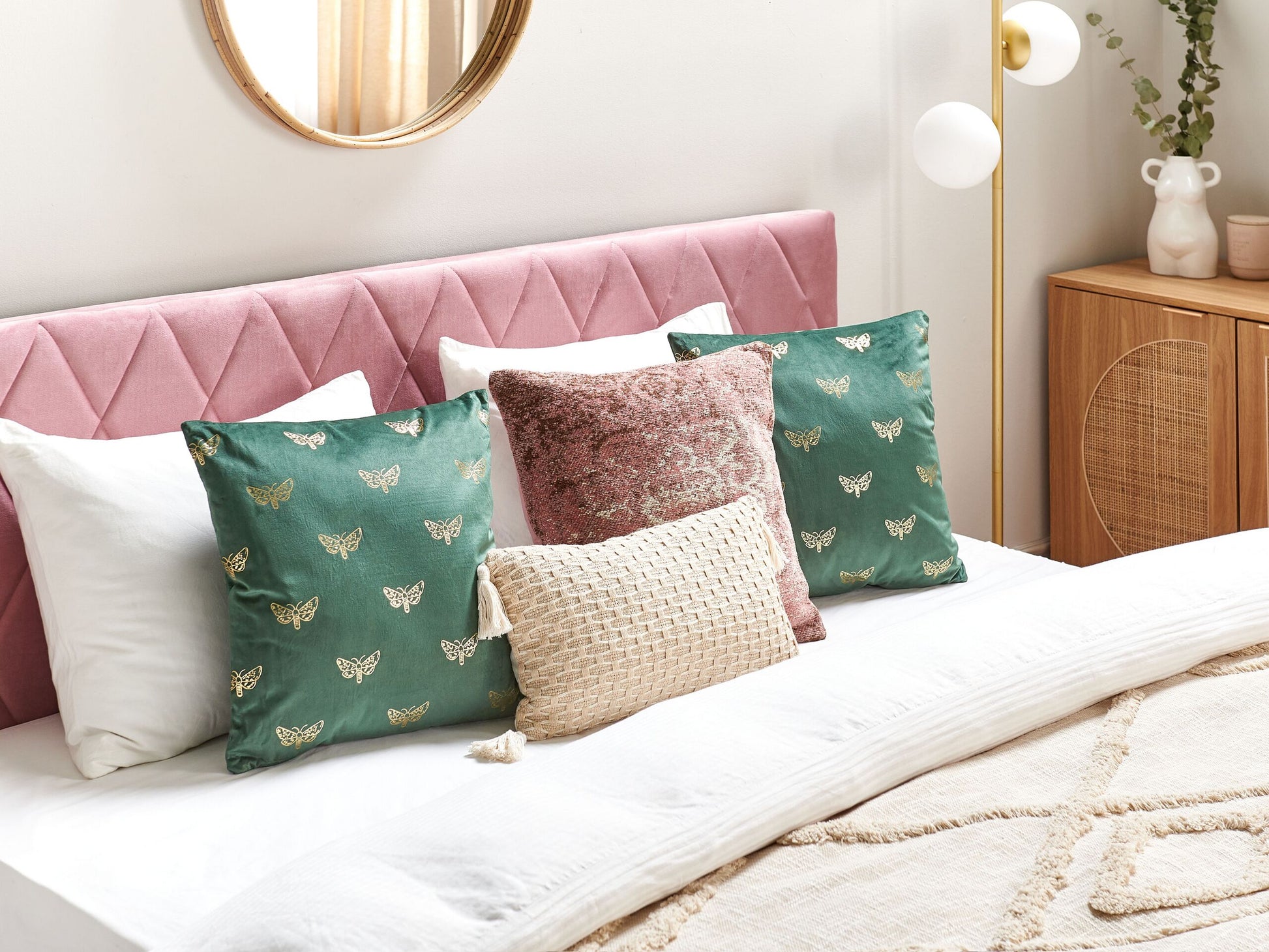 Beschreibung: Verleihen Sie Ihrem Zuhause mit diesem Kissen-Set einen eleganten und gemütlichen Look. Die Bezüge sind aus Samt gefertigt und mit einem Foliendruck verziert. Die Kissen haben eine weiche Füllung und einen praktischen Reissverschluss. Dank des schönen Schmetterlingsmusters verleiht das Kissenset jedem modernen und traditionellen Einrichtungsstil Charme. Material: Samtstoff. Material Zusammensetzung: 100% Polyester Montage: Benötigt keine Montage Das Angebot beinhaltet: 2 x Zierkissen Höhe: 10 zusätzliche Information: Das Kissen ist vakuumverpackt. Nehmen Sie Ihr Kissen aus der Verpackung heraus und lassen Sie es 24 Stunden lang liegen, bis es seine volle Dichte erreicht., Bitte beachten Sie, dass Samtstoff unter verschiedenen Lichtverhältnissen eine andere Optik haben kann – das Material schimmert bei Tageslicht stärker und wirkt bei künstlicher Beleuchtung in Innenräumen eher gedämpft. Aufgrund der glatten, hochdichten Struktur des Gewebes kann sein Farbton auch variieren, wenn man mit der Hand in verschiedene Richtungen und Winkel über den Stoff fährt. Um den Farbton auszugleichen und Druckstellen zu vermeiden, sollte der Webstoff sanft mit einer offenen Handfläche in eine Richtung gestrichen, mit einem feuchten Tuch abgewischt oder einem Dampfbügeleisen gebügelt werden. Gestalten: Quadratisch Breite: 45 Tiefe: 45 Art: Dekokissen 2er Set Stil: Klassisch Allgemeine Farbe: Grün Schatten: Smaragdgrün Muster: Tiermuster Hauptmaterial: Samtstoff Füllmaterial: Polyester