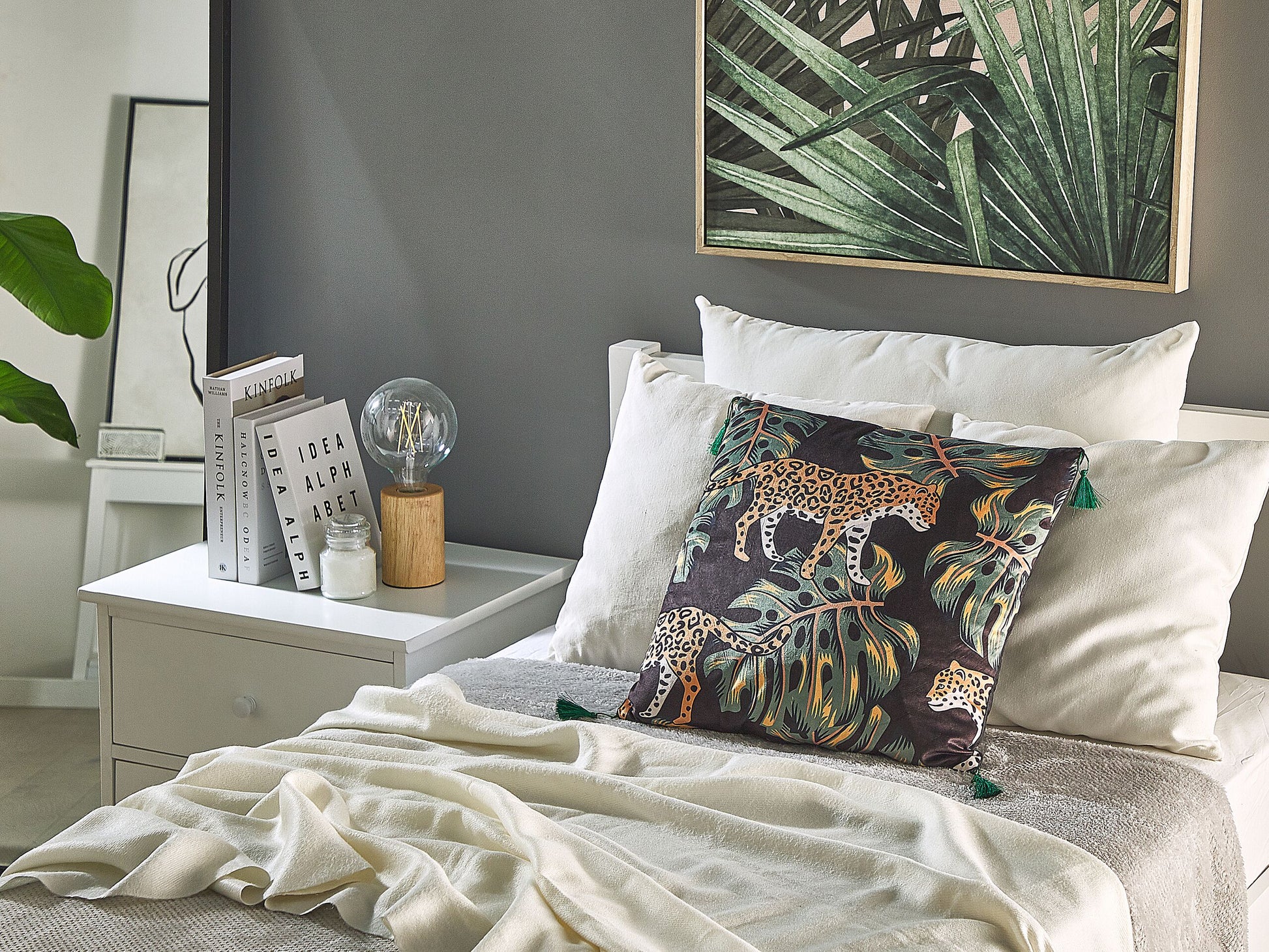 Mit diesen beiden dunklen Zierkissen und ihren Tiermotiven verleihen Sie Ihrem Sofa oder Bett einen angesagten Dschungel-Look. Die Vorderseiten der Kissenbezüge sind mit Leoparden- und Monstera-Mustern versehen, während die Rückseiten einfarbig gehalten sind. Zudem verfügen die Sofakissen über zusätzliche Reissverschlüsse, die auf einer der Kissenseiten versteckt sind. Die grünen Quasten sorgen für einen reizenden Akzent, während die dicke Polyester-Füllung und die angenehme Haptik des Kissens den Komfort auf Ihren Möbeln steigert. Material: Samtstoff. Material Zusammensetzung: 100% Polyester Montage: Benötigt keine Montage Das Angebot beinhaltet: 2 x Zierkissen Höhe: 12 zusätzliche Information: Das Kissen ist vakuumverpackt. Nehmen Sie Ihr Kissen aus der Verpackung heraus und lassen Sie es 24 Stunden lang liegen, bis es seine volle Dichte erreicht. Gestalten: Quadratisch Breite: 45 Tiefe: 45 Art: Dekokissen 2er Set Stil: Modern Allgemeine Farbe: Schwarz Muster: Tiermuster Hauptmaterial: Samtstoff Füllmaterial: Schaumstoff