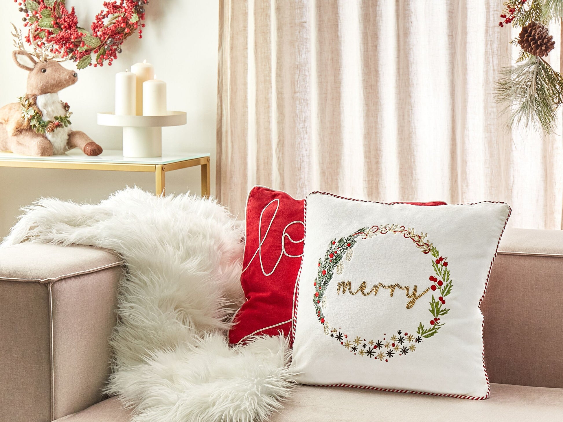 Die Vorderseite der Kissenhülle besteht aus geschmeidigem Baumwollsamt und sit mit einem Weihnachtsmuster versehen, während die Rückseite des Bezugs sich aus weichen Baumwollfasern zusammensetzt. Zudem ist das Sofakissen mit einem weichen Füllmaterial aus Polyester, einem praktischen Reissverschluss und einer weiss-roten Biese ausgestattet. Das angesagte, gestickte Motiv setzt sich aus verschiedenen Weihnachtssymbolen zusammen und wird durch einen goldenen Perlen-Schriftzug ergänzt. Material: Samtstoff. Material Zusammensetzung: 100% Baumwolle Montage: Benötigt keine Montage Das Angebot beinhaltet: 1 x Zierkissen Höhe: 8 zusätzliche Information: Das Kissen ist vakuumverpackt. Nehmen Sie Ihr Kissen aus der Verpackung heraus und lassen Sie es 24 Stunden lang liegen, bis es seine volle Dichte erreicht., Bitte beachten Sie, dass Samtstoff unter verschiedenen Lichtverhältnissen eine andere Optik haben kann – das Material schimmert bei Tageslicht stärker und wirkt bei künstlicher Beleuchtung in Innenräumen eher gedämpft. Aufgrund der glatten, hochdichten Struktur des Gewebes kann sein Farbton auch variieren, wenn man mit der Hand in verschiedene Richtungen und Winkel über den Stoff fährt. Um den Farbton auszugleichen und Druckstellen zu vermeiden, sollte der Webstoff sanft mit einer offenen Handfläche in eine Richtung gestrichen, mit einem feuchten Tuch abgewischt oder einem Dampfbügeleisen gebügelt werden. Gestalten: Quadratisch Breite: 45 Tiefe: 45 Art: Dekokissen Stil: Modern Allgemeine Farbe: Weiss Muster: Weihnachtsmotiv Hauptmaterial: Samtstoff Füllmaterial: Polyester