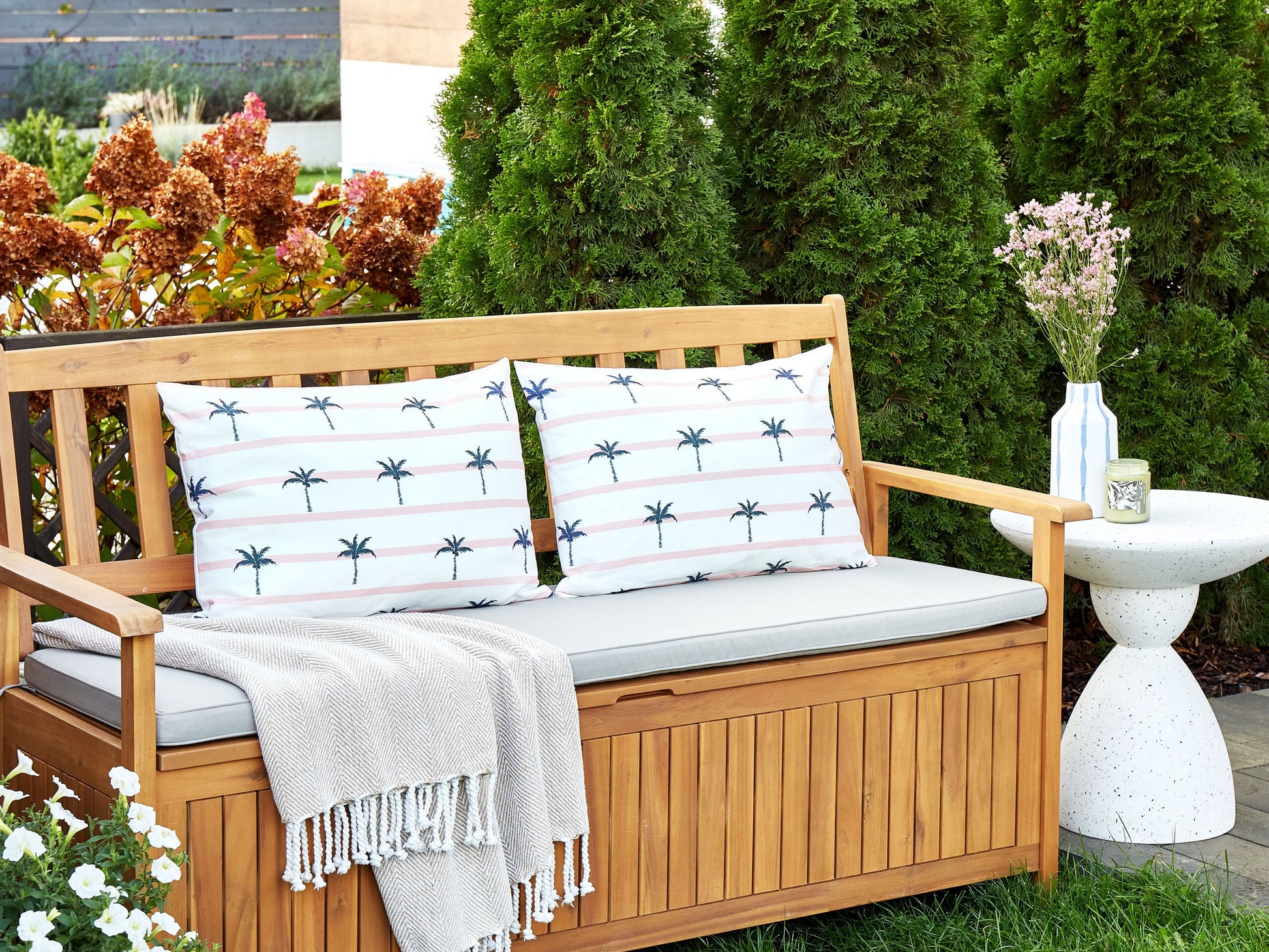 Das Set aus zwei Kissen mit modernem Palmenmotiv bringt frischen Wind in Ihre Einrichtung. Diese Accessoires, die sich sowohl für den Innen- als auch für den Aussenbereich eignen, sind mit strapazierfähigem Polyester überzogen und mit hochwertigem Polyesterplüsch gefüllt. Dank der abnehmbaren Bezüge ist die Pflege äusserst mühelos - einfach per Hand waschen und die tropische Eleganz in den eigenen vier Wänden geniessen.  Material: Polyester. Material Zusammensetzung: 100% Polyester Montage: Benötigt keine Montage Das Angebot beinhaltet: 2 x Gartenkissen Höhe: 10 zusätzliche Information: Das Kissen ist vakuumverpackt. Nehmen Sie Ihr Kissen aus der Verpackung heraus und lassen Sie es 24 Stunden lang liegen, bis es seine volle Dichte erreicht. Gestalten: Rechteckig Breite: 40 Tiefe: 60 Art: Gartenkissen 2er Set Stil: Modern Allgemeine Farbe: Weiss Muster: Streifenmuster Hauptmaterial: Polyester Füllmaterial: Polyester