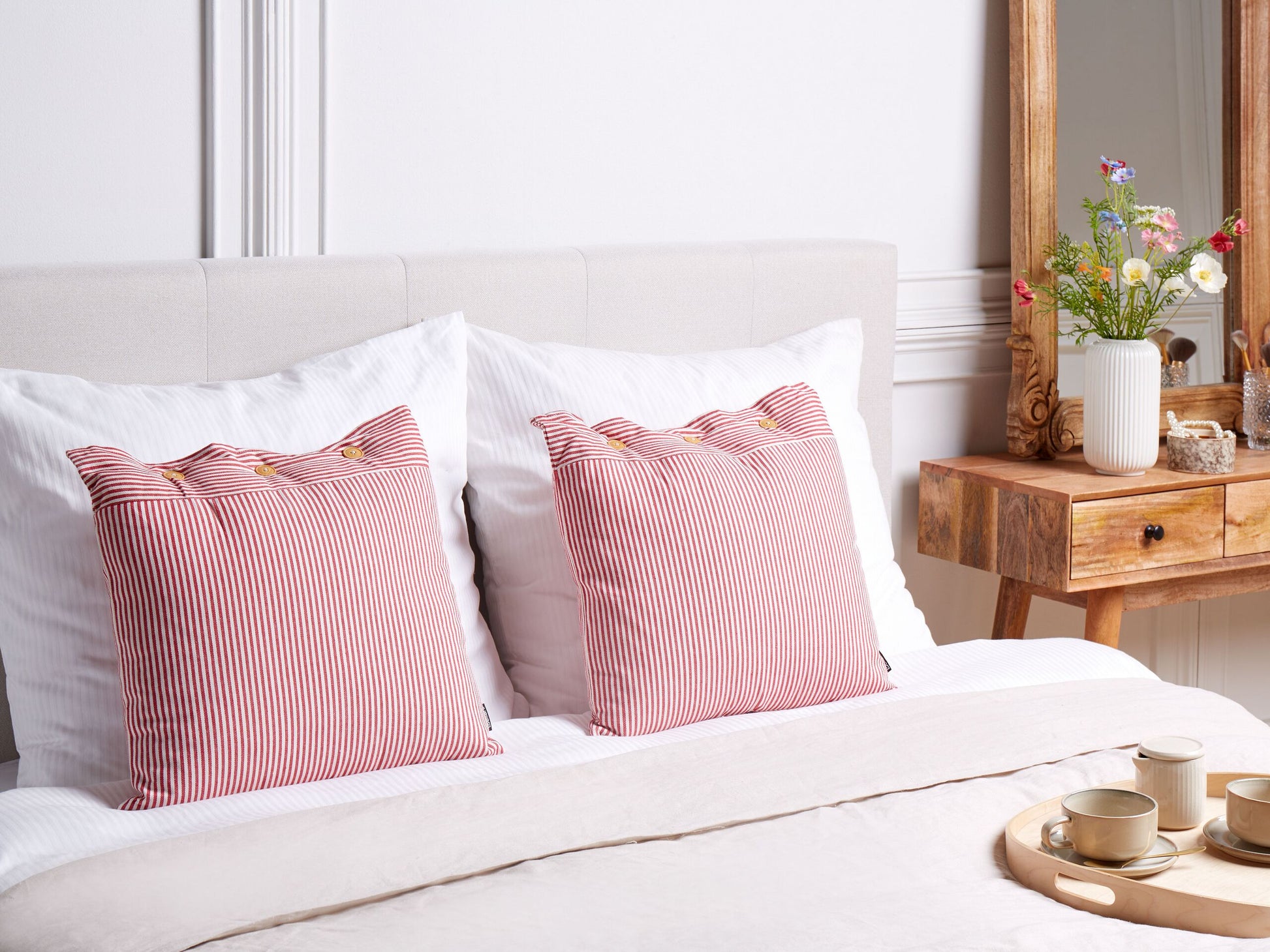 Beschreibung: Verschönern Sie Ihre Wohnräume mit diesen Zierkissen, die mit ihren Texturen, ihrer Gemütlichkeit und ihrem Design verzaubern. Ihre Baumwollbezüge fühlen sich nicht nur sanft an, sondern sind auch sehr pflegeleicht und strapazierfähig. Die schicken rot-weissen Streifenmuster befinden sich auf beiden Seiten der Kissenbezüge, so lassen sich die Kissen beidseitig gebrauchen. Zudem verfügen die Kissenhüllen über dekorative Knopfverschlüsse. Diese Kunststoff-Knöpfe sind in einer wunderschönen Holzoptik gehalten und unterstreichen den Retro-Look der Sofakissen. Dank grosszügiger Polyester-Füllungen sind die Dekokissen angenehm weich und komfortabel. Material: Baumwolle. Zusätzliches Material: Kunststoff. Material Zusammensetzung: 100% Baumwolle Montage: Benötigt keine Montage Das Angebot beinhaltet: 2 x Zierkissen Höhe: 12 zusätzliche Information: Das Kissen ist vakuumverpackt. Nehmen Sie Ihr Kissen aus der Verpackung heraus und lassen Sie es 24 Stunden lang liegen, bis es seine volle Dichte erreicht. Gestalten: Quadratisch Breite: 45 Tiefe: 45 Art: Dekokissen 2er Set Stil: Retro Allgemeine Farbe: Rot Muster: Streifenmuster Hauptmaterial: Baumwolle Füllmaterial: Polyester