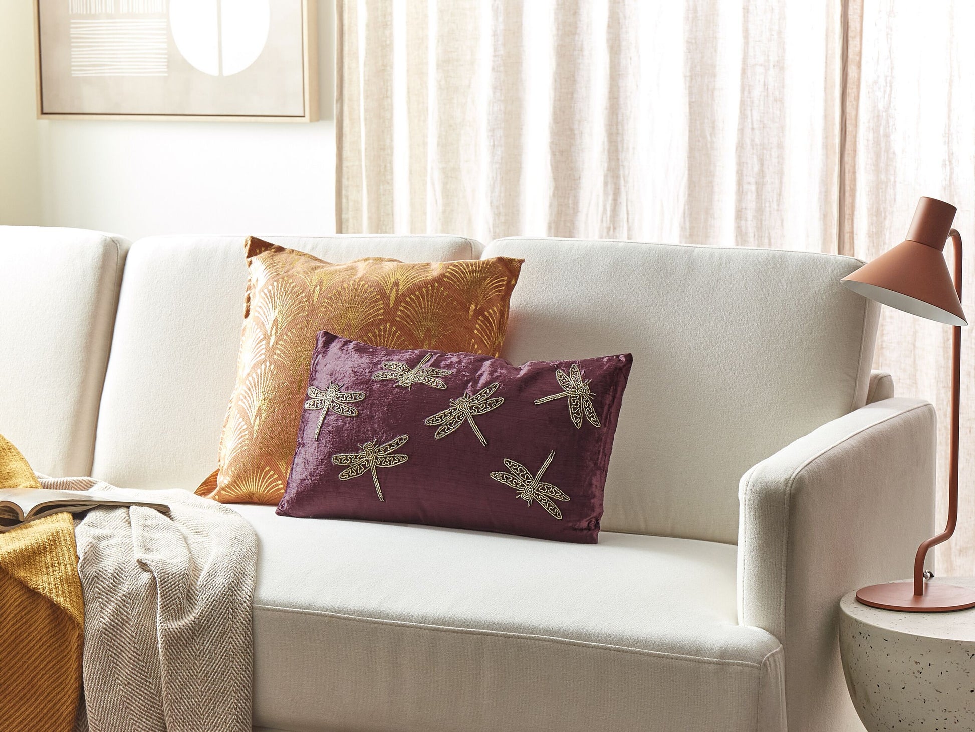 Dieses aussergewöhnliche Zierkissen lädt zu einer Reise in die Eleganz ein. Der Samtbezug verzaubert mit seiner handwerklichen Schönheit und der königliche Farbton verleiht Ihrem Raum einen edlen Touch. Das aufwendig gestickte Libellenmotiv, das über die geschmeidige Samt-Oberfläche schwebt, wird Sie begeistern. Der abnehmbare Kissenbezug und der diskret eingebaute Reissverschluss verbinden Funktionalität und Stil nahtlos miteinander. Material: Samtstoff. Zusätzliches Material: Baumwolle. Material Zusammensetzung: 50% Viskose, 50 % Baumwolle Montage: Benötigt keine Montage Das Angebot beinhaltet: 1 x Zierkissen Höhe: 6 zusätzliche Information: Das Kissen ist vakuumverpackt. Nehmen Sie Ihr Kissen aus der Verpackung heraus und lassen Sie es 24 Stunden lang liegen, bis es seine volle Dichte erreicht., Bitte beachten Sie, dass Samtstoff unter verschiedenen Lichtverhältnissen eine andere Optik haben kann – das Material schimmert bei Tageslicht stärker und wirkt bei künstlicher Beleuchtung in Innenräumen eher gedämpft. Aufgrund der glatten, hochdichten Struktur des Gewebes kann sein Farbton auch variieren, wenn man mit der Hand in verschiedene Richtungen und Winkel über den Stoff fährt. Um den Farbton auszugleichen und Druckstellen zu vermeiden, sollte der Webstoff sanft mit einer offenen Handfläche in eine Richtung gestrichen, mit einem feuchten Tuch abgewischt oder einem Dampfbügeleisen gebügelt werden., Da jedes Produkt handgefertigt wird, kann es zu kleineren Abweichungen in der Farbe und der äusseren Struktur kommen. Diese Abweichungen stellen keinen Qualitätsmangel dar, sondern sind eine warentypische Eigenschaft. Gestalten: Rechteckig Breite: 50 Tiefe: 30 Art: Dekokissen Stil: Modern Allgemeine Farbe: Violett Schatten: Purpur Muster: Tiermuster Hauptmaterial: Samtstoff Füllmaterial: Polyester