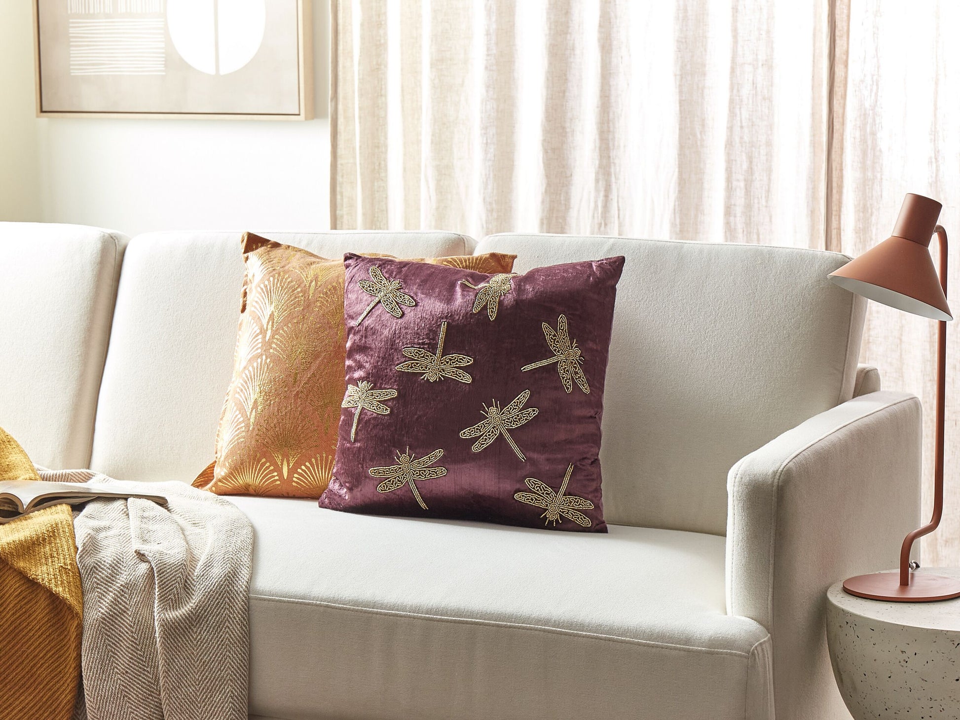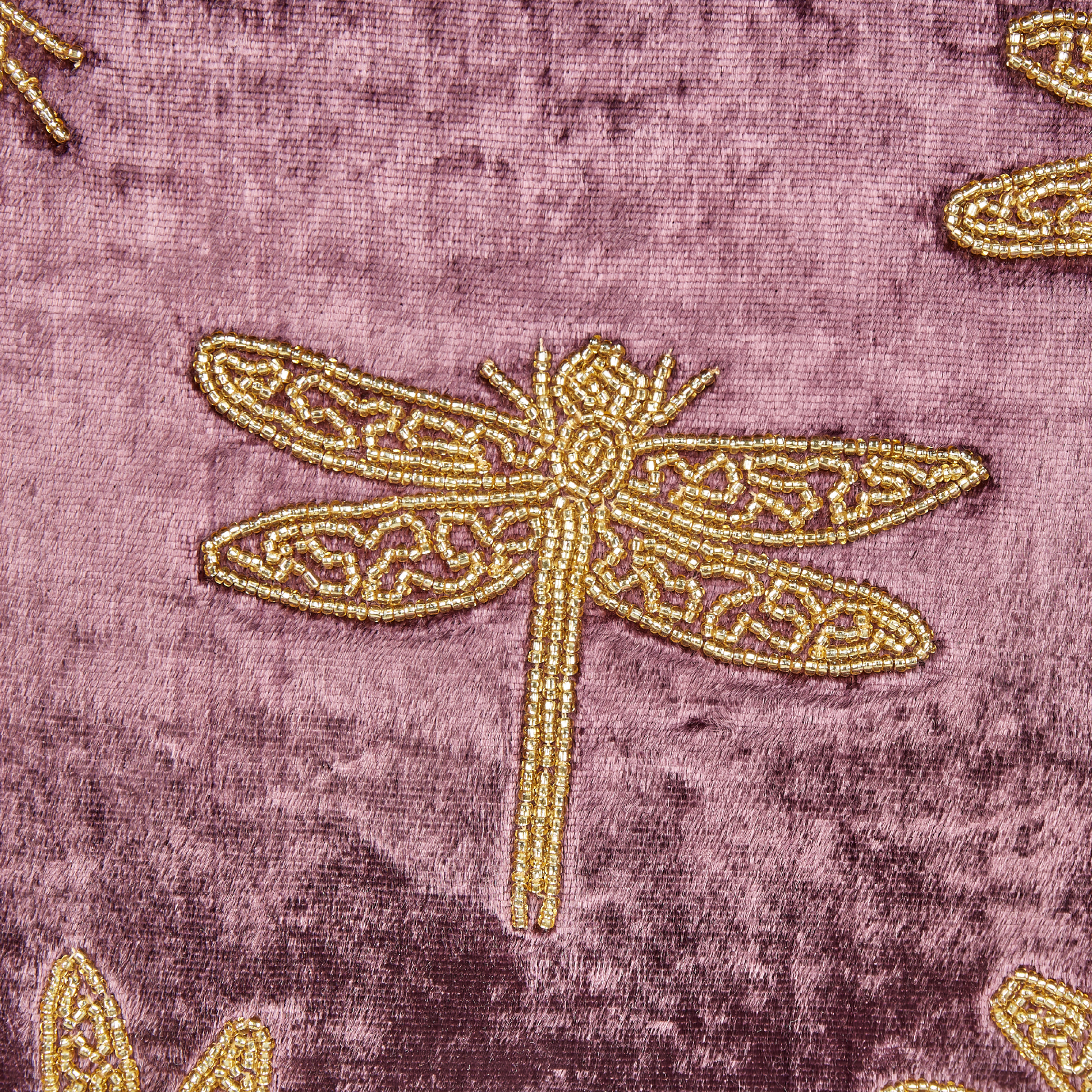 Beschreibung: Dieses aussergewöhnliche Zierkissen lädt zu einer Reise in die Eleganz ein. Der Samtbezug verzaubert mit seiner handwerklichen Schönheit und der königliche Farbton verleiht Ihrem Raum einen edlen Touch. Das aufwendig gestickte Libellenmotiv, das über die geschmeidige Samt-Oberfläche schwebt, wird Sie begeistern. Der abnehmbare Kissenbezug und der diskret eingebaute Reissverschluss verbinden Funktionalität und Stil nahtlos miteinander. Material: Samtstoff. Zusätzliches Material: Baumwolle. Material Zusammensetzung: 50% Viskose, 50 % Baumwolle Montage: Benötigt keine Montage Das Angebot beinhaltet: 1 x Zierkissen Höhe: 9 zusätzliche Information: Das Kissen ist vakuumverpackt. Nehmen Sie Ihr Kissen aus der Verpackung heraus und lassen Sie es 24 Stunden lang liegen, bis es seine volle Dichte erreicht., Bitte beachten Sie, dass Samtstoff unter verschiedenen Lichtverhältnissen eine andere Optik haben kann – das Material schimmert bei Tageslicht stärker und wirkt bei künstlicher Beleuchtung in Innenräumen eher gedämpft. Aufgrund der glatten, hochdichten Struktur des Gewebes kann sein Farbton auch variieren, wenn man mit der Hand in verschiedene Richtungen und Winkel über den Stoff fährt. Um den Farbton auszugleichen und Druckstellen zu vermeiden, sollte der Webstoff sanft mit einer offenen Handfläche in eine Richtung gestrichen, mit einem feuchten Tuch abgewischt oder einem Dampfbügeleisen gebügelt werden., Da jedes Produkt handgefertigt wird, kann es zu kleineren Abweichungen in der Farbe und der äusseren Struktur kommen. Diese Abweichungen stellen keinen Qualitätsmangel dar, sondern sind eine warentypische Eigenschaft. Gestalten: Quadratisch Breite: 45 Tiefe: 45 Art: Dekokissen Stil: Modern Allgemeine Farbe: Violett Schatten: Purpur Muster: Tiermuster Hauptmaterial: Samtstoff Füllmaterial: Polyester