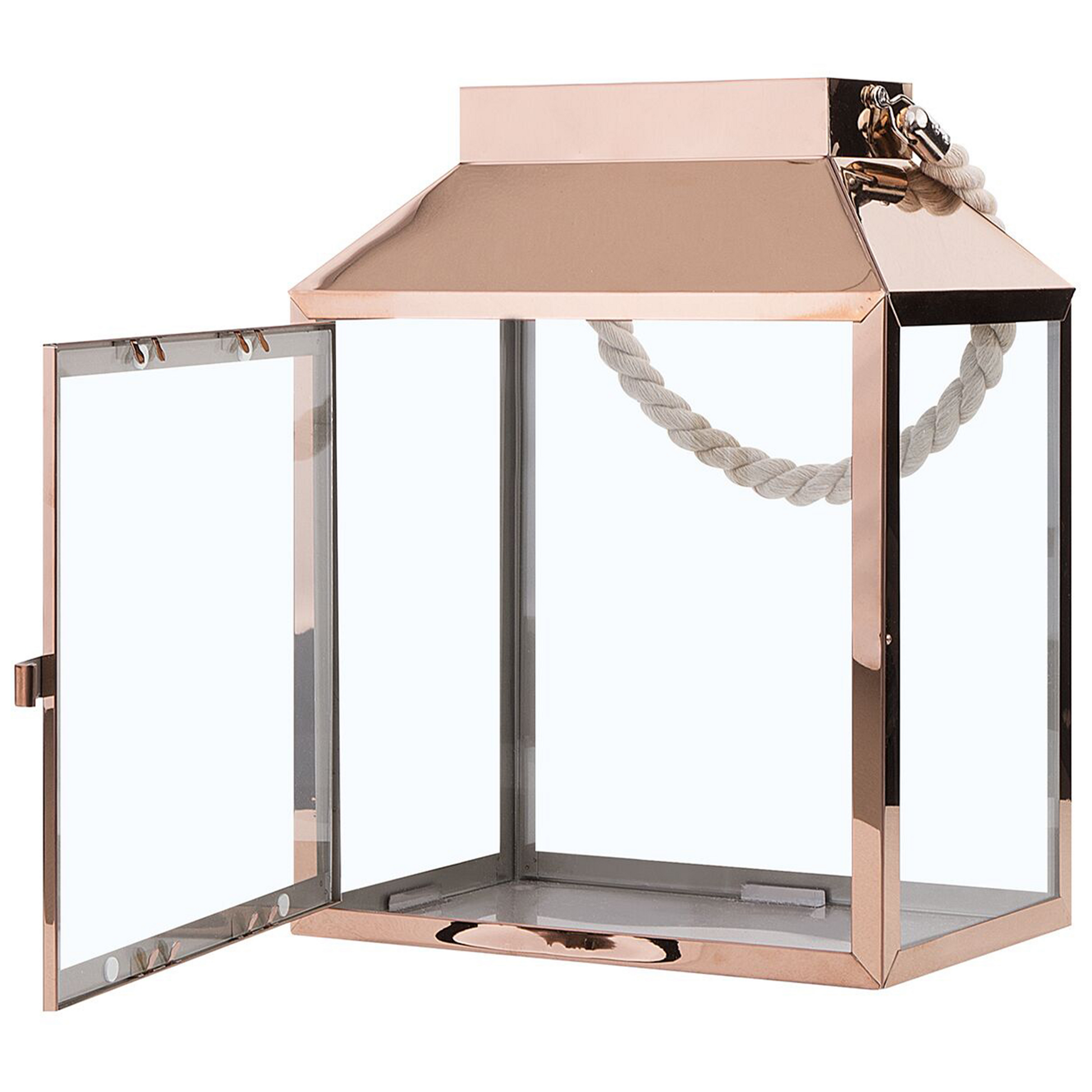 Verleihen Sie Ihrem Innenraum einen besonders gemütlichen Charme und bestücken Sie die Laterne mit Kerzen oder Lichterketten, um sie in einem kuscheligen Licht erstrahlen zu lassen. Dabei kann das Windlicht sowohl stehend als auch hängend genutzt werden. Zudem erlauben die wetterfesten Materialien auch eine Nutzung im Aussenbereich. Material: Edelstahl. Zusätzliches Material: Sicherheitsglas. Gewicht: 2 Montage: Benötigt keine Montage Das Angebot beinhaltet: 1 x Laterne Höhe: 33 Gestalten: Rechteckig Breite: 26 Tiefe: 17 Art: Dekoration Stil: Modern Allgemeine Farbe: Kupfer Hauptmaterial: Edelstahl