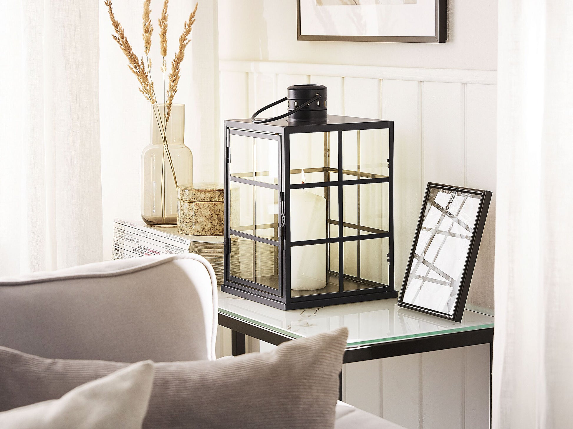Der minimalistische Look dieser Laterne macht sie zum perfekten Accessoire für moderne Einrichtungen. Die rechteckige Form und die Glasscheiben, eingelassen in die schwarze Metallkonstruktion, lassen eine Kerze oder andere Dekoelemente gut zur Geltung kommen. Material: Metall. Zusätzliches Material: Glas. Gewicht: 3 Montage: Benötigt keine Montage Das Angebot beinhaltet: 1 x Laterne Höhe: 33 Gestalten: Quadratisch Breite: 20 Tiefe: 20 Art: Laterne Stil: Skandinavisch Allgemeine Farbe: Schwarz Hauptmaterial: Metall