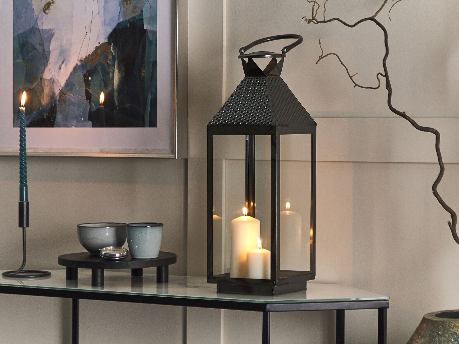 Klassisches Dekoaccessoire mit Wohlfühlatmosphäre - mit dieser Laterne holen Sie sich ein Stück Gemütlichkeit in Ihren Wohnraum. Gefertigt ist das Windlicht aus Edelstahl und Sicherheitsglas, wodurch Sie es sowohl im Innen- als auch Aussenbereich nutzen können. Zudem lässt sich die Laterne ganz leicht an der Seite öffnen, um sie mit Kerzen oder Dekomaterial zu befüllen. Material: Edelstahl. Zusätzliches Material: Sicherheitsglas. Gewicht: 2 Montage: Benötigt keine Montage Das Angebot beinhaltet: 1 x Laterne Höhe: 54 Gestalten: Rechteckig Breite: 19 Tiefe: 19 Art: Laterne Stil: Modern Allgemeine Farbe: Schwarz Hauptmaterial: Edelstahl