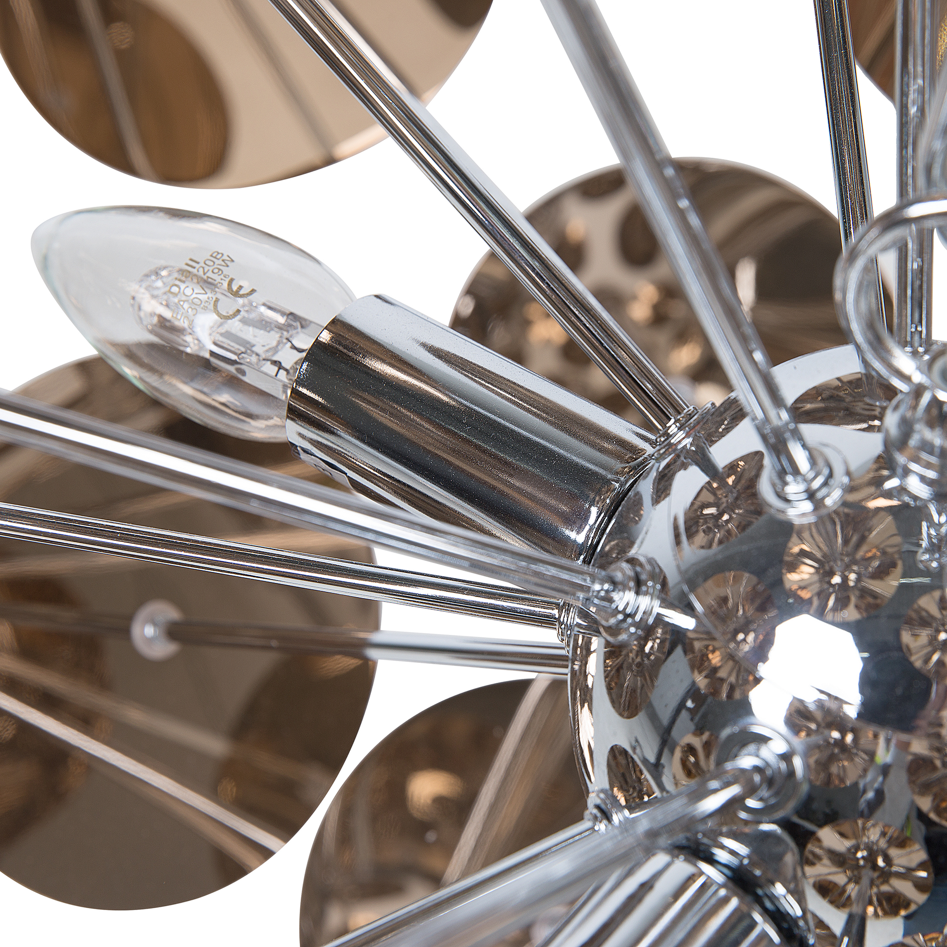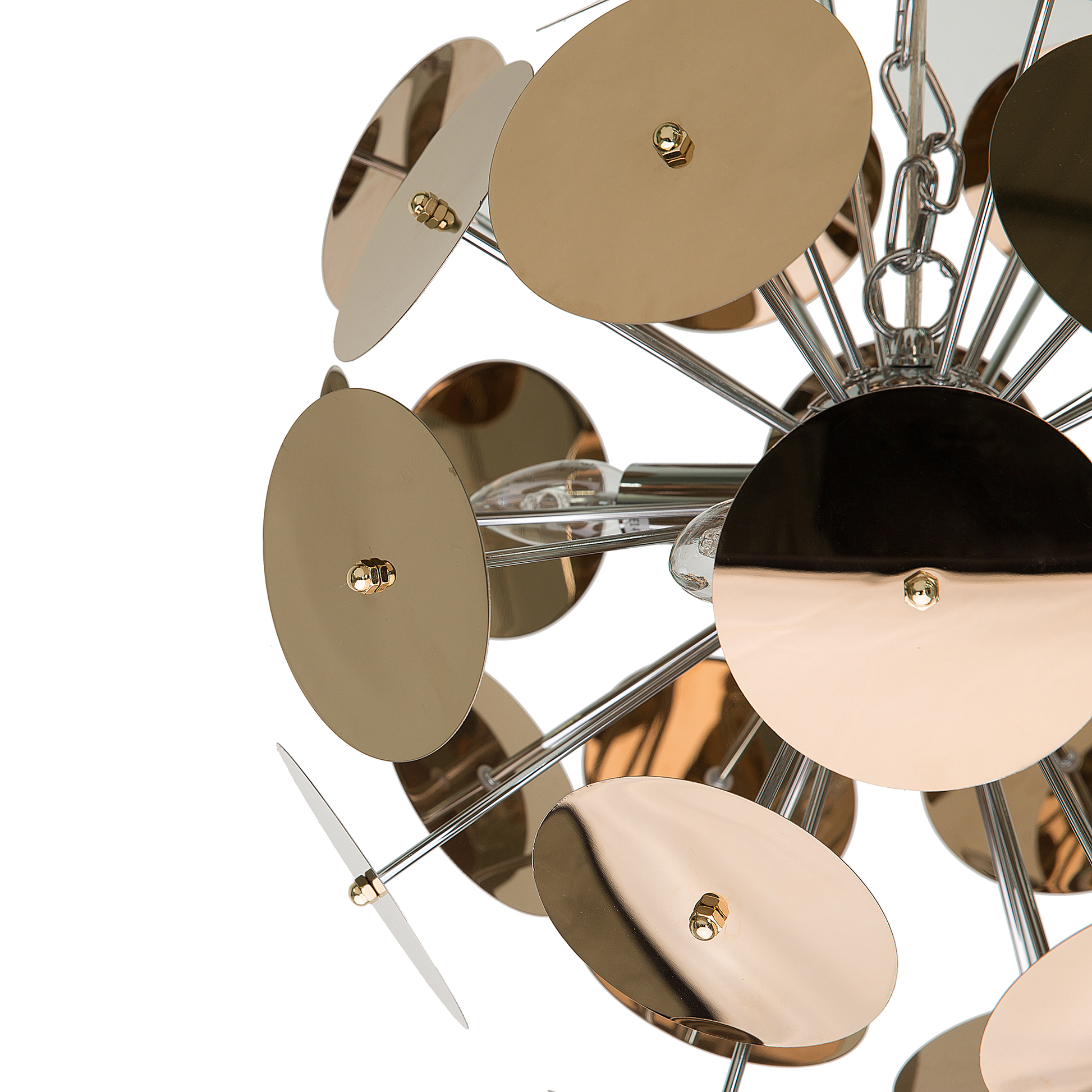 Die ungewöhnliche, zusammengesetzte Form des Schirms lässt eindrucksvolle Licht- und Schatteneffekte entstehen. Wenn die Pendelleuchte eingeschaltet ist sorgt die glänzende, verchromte Innenseite der kreisförmigen Scheiben für zusätzliche Reflexe. Eine aufregende und verspielte Beleuchtung, die mit Abstand eine der schönsten unter allen Eyecatchern ist. Material: Edelstahl. Zusätzliches Material: Metall, PVC. Gewicht: 3 Montage: Erfordert Installation und Montage Das Angebot beinhaltet: 1 x Hängeleuchte, Nicht im Lieferumfang enthalten: Leuchtmittel Höhe: 158 zusätzliche Information: Diese Leuchte ist geeignet für Leuchtmittel der Energieklassen A bis G auf einer Skala von A (sehr effizient) bis G (weniger effizient). Geeignet für: LED Leuchtmittel, Eco-Halogen Leuchtmittel, Energiesparleuchtmittel., Die Stromkabel dürfen nur von einem qualifizierten Elektriker angepasst werden. Breite: 50 Tiefe: 50 Art: Hängelampe Stil: Modern Allgemeine Farbe: Kupfer Hauptmaterial: Edelstahl Fassung: Max. 40 W IP Protection Code: IP 20