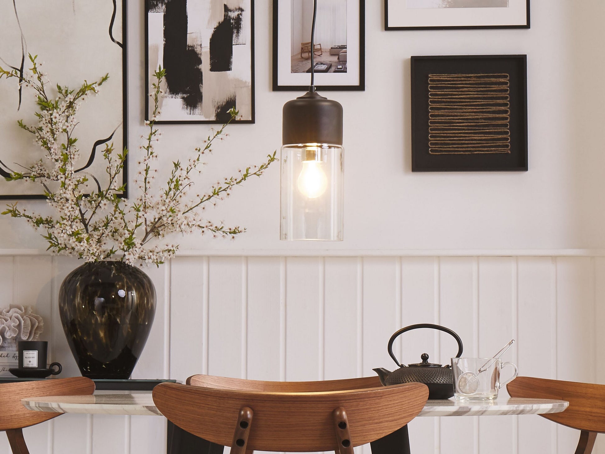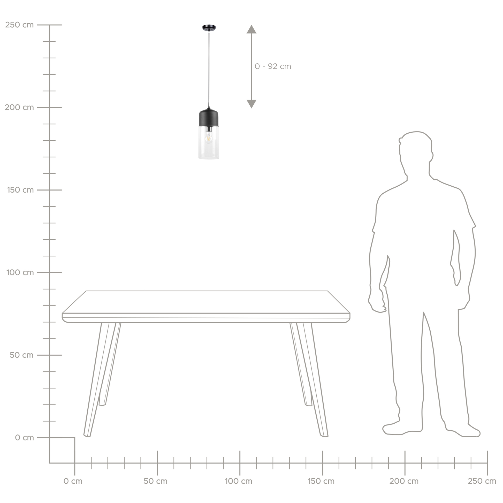 Die Pendelleuchte wird Sie begeistern mit einer raffinierten Farbkombination aus Schwarz und Transparent, ihrem funktionalen und markanten Design und der länglichen, schlanken Form. Das dekorative Lampengehäuse aus Glas sorgt für strahlend helle Beleuchtung. Material: Glas. Zusätzliches Material: Stahl. Gewicht: 1 Montage: Installation benötigt Das Angebot beinhaltet: 1 x Hängeleuchte, Nicht im Lieferumfang enthalten: Leuchtmittel Höhe: 126 zusätzliche Information: Diese Leuchte ist geeignet für Leuchtmittel der Energieklassen A bis G auf einer Skala von A (sehr effizient) bis G (weniger effizient). Geeignet für: LED Leuchtmittel, Eco-Halogen Leuchtmittel, Energiesparleuchtmittel., Die Stromkabel dürfen nur von einem qualifizierten Elektriker angepasst werden. Breite: 13 Tiefe: 13 Art: Hängelampe Stil: Modern Allgemeine Farbe: Schwarz Hauptmaterial: Glas Fassung: Max. 60 W IP Protection Code: IP 20