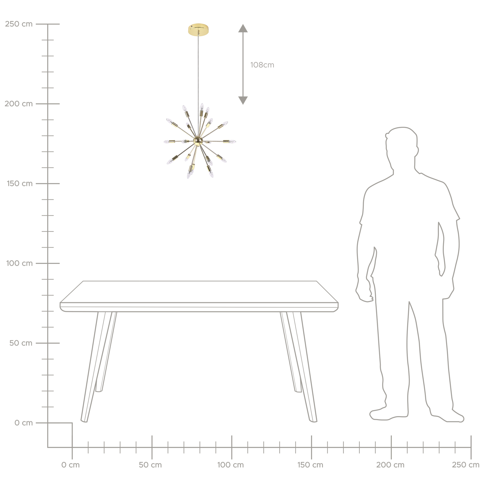 Ein toller Lichtakzent am Esstisch. Das extravagante, prachtvolle Aussehen der dekorativen Lichtergruppe aus Eisen macht sie zu einem wahren Blickfang. Zudem, ist sie nicht nur ein wunderschönes Wohnaccessoire, sondern sorgt mit ihrem Licht auch für eine angenehme, warme Stimmung im Raum, die wirklich einmalig ist. Material: Eisen. Zusätzliches Material: PVC. Gewicht: 2 Montage: Erfordert Installation und Montage Das Angebot beinhaltet: 1 x Hängeleuchte, Nicht im Lieferumfang enthalten: Leuchtmittel Höhe: 149 zusätzliche Information: Diese Leuchte ist geeignet für Leuchtmittel der Energieklassen A bis G auf einer Skala von A (sehr effizient) bis G (weniger effizient). Geeignet für: LED Leuchtmittel, Eco-Halogen Leuchtmittel, Energiesparleuchtmittel., Die Stromkabel dürfen nur von einem qualifizierten Elektriker angepasst werden. Breite: 59 Tiefe: 59 Art: Hängelampe Stil: Modern Allgemeine Farbe: Gold Hauptmaterial: Eisen Fassung: Max. 40 W IP Protection Code: IP 20