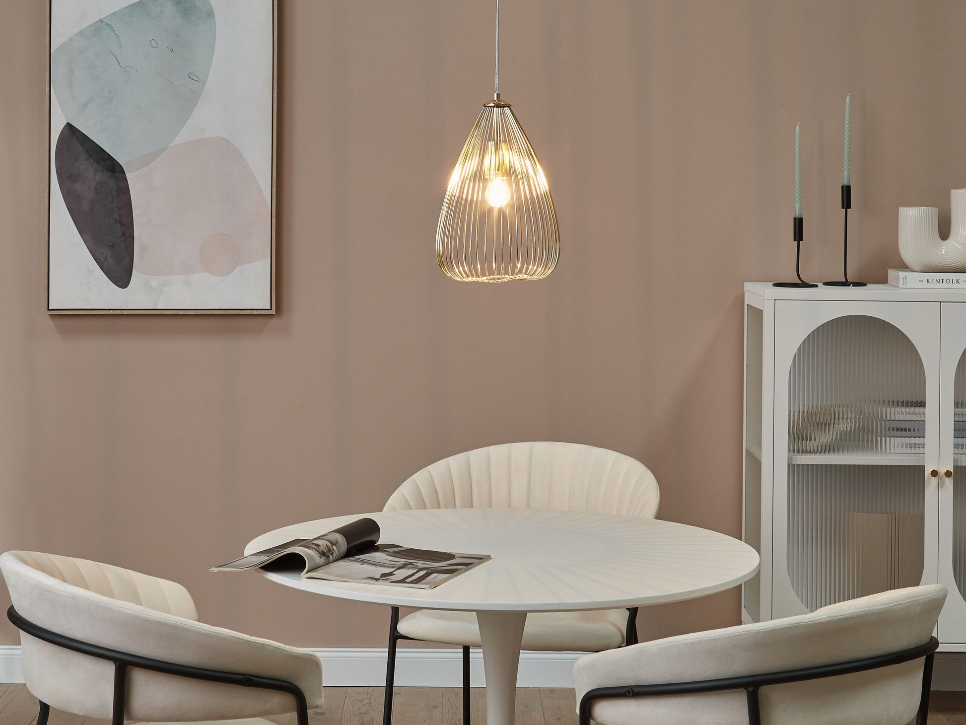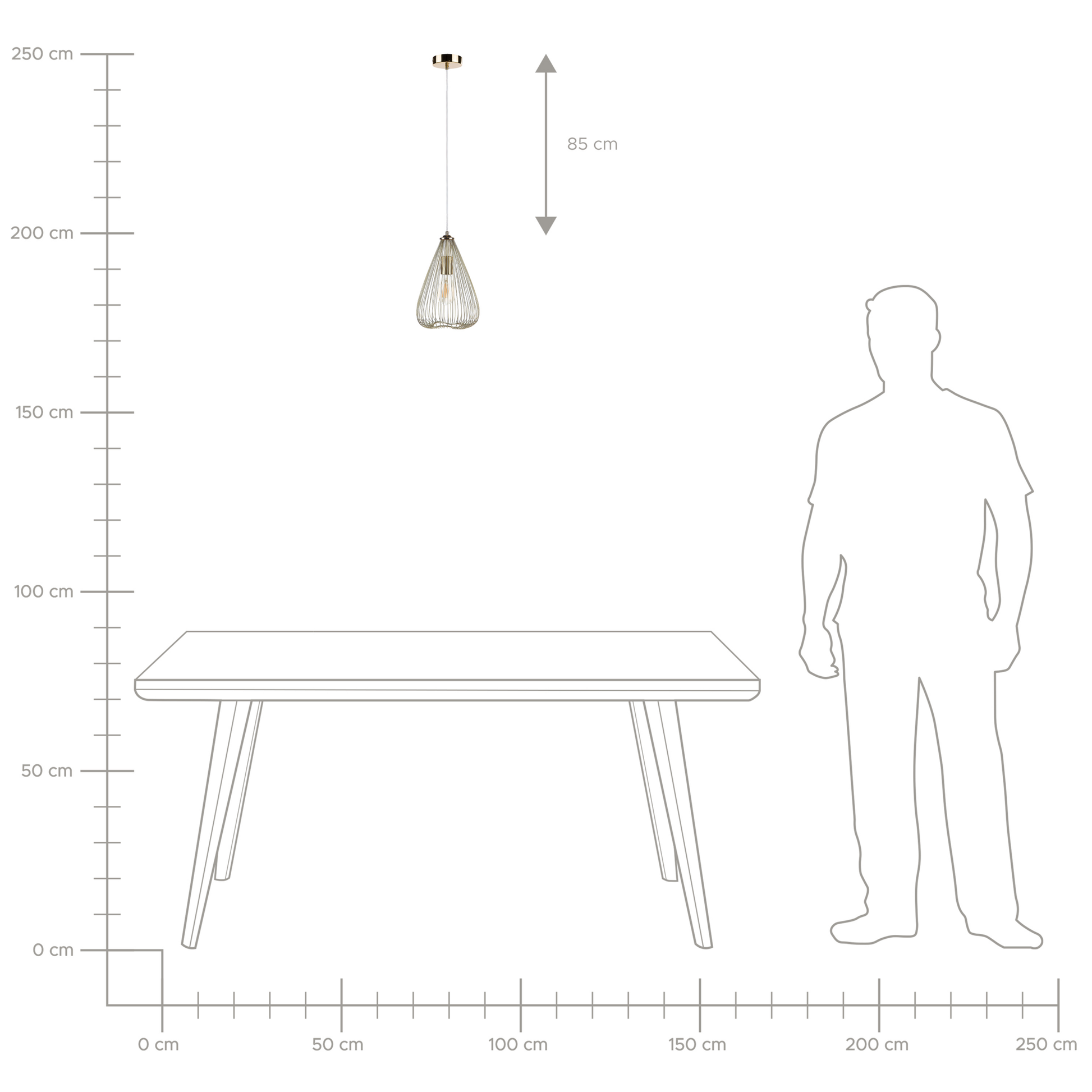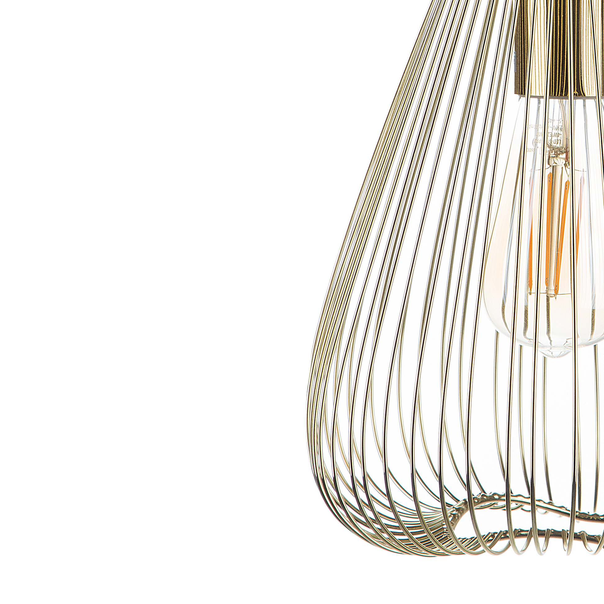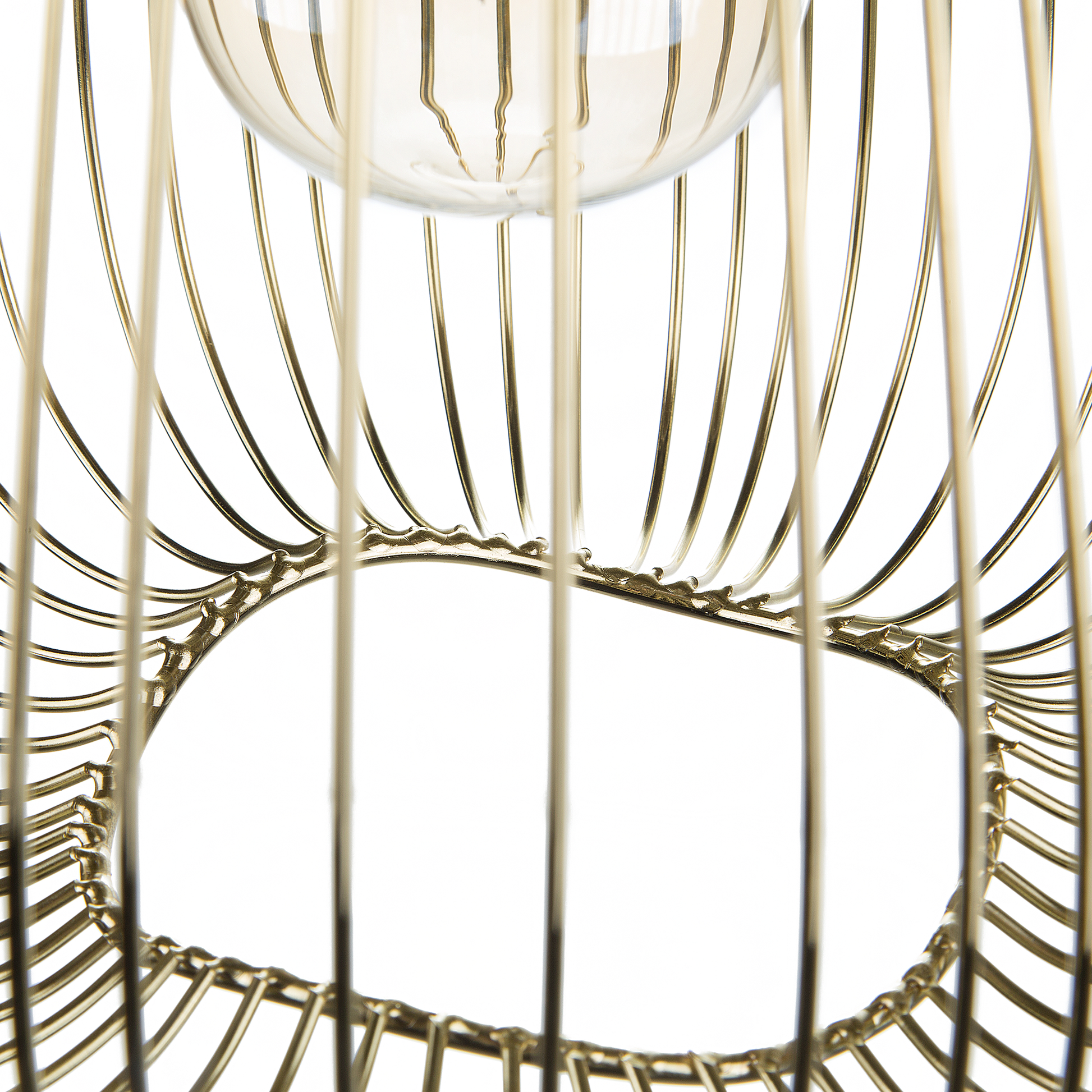 Robustes Material trifft auf modernes Design. Die Glühbirne dieser Leuchte wird von schlanken, goldfarbenen Metallstreben umgeben wie von einem länglichen Käfig. Schon in ausgeschaltetem Zustand ist die Lampe ein trendy Hingucker, und sobald ihre Birne hell erstrahlt, wirft sie aufregende Schattenmuster an Ihre Wände. Material: Eisen. Zusätzliches Material: PVC. Gewicht: 1 Montage: Erfordert Installation und Montage Das Angebot beinhaltet: 1 x Hängeleuchte, Nicht im Lieferumfang enthalten: Leuchtmittel Höhe: 120 zusätzliche Information: Diese Leuchte ist geeignet für Leuchtmittel der Energieklassen A bis G auf einer Skala von A (sehr effizient) bis G (weniger effizient). Geeignet für: LED Leuchtmittel, Eco-Halogen Leuchtmittel, Energiesparleuchtmittel., Die Stromkabel dürfen nur von einem qualifizierten Elektriker angepasst werden. Breite: 22 Tiefe: 22 Art: Hängelampe Stil: Glamourös Allgemeine Farbe: Gold Hauptmaterial: Eisen Fassung: Max. 60 W IP Protection Code: IP 20