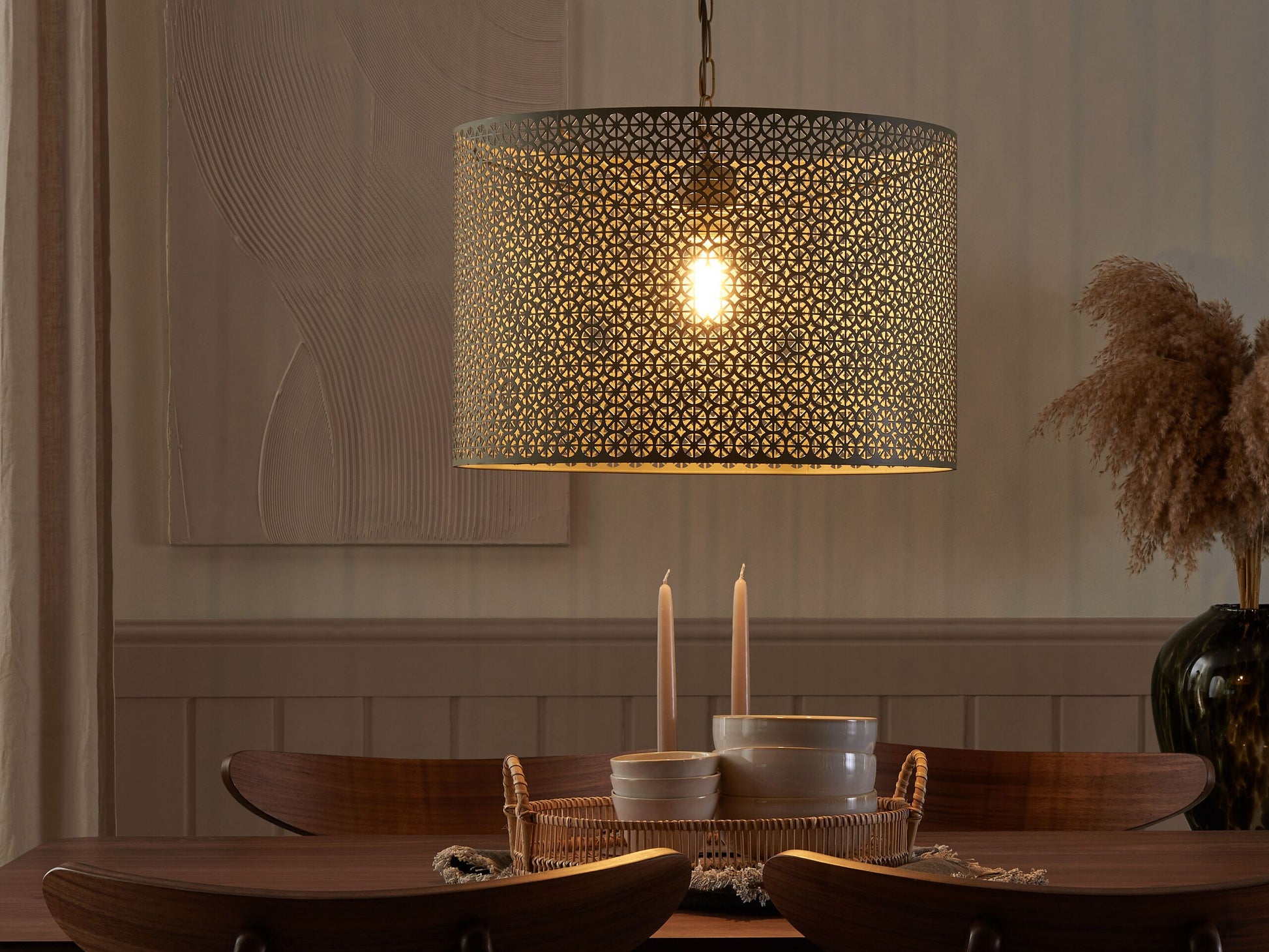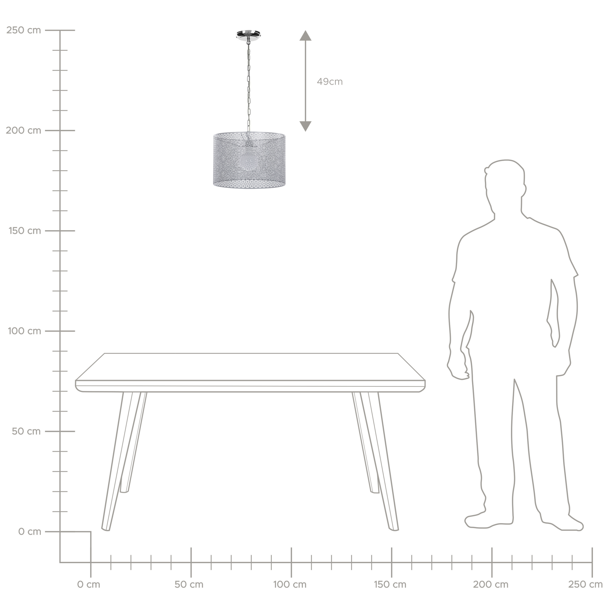 Lassen Sie Ihr Heim in einem neuen Licht erstrahlen. Diese Hängeleuchte ist mehr als nur eine Lichtquelle, sie ist ein Designerstück für Ihr Wohn-, Ess- und Schlafzimmer. Der grosse, runde Lampenschirm aus graufarbenem Metall ist halb durchsichtig und mit einen wunderschönen Muster versehen, das einen orientalischen Charm versprüht. Material: Metall. Zusätzliches Material: PVC. Gewicht: 2 Montage: Installation benötigt Das Angebot beinhaltet: 1 x Hängeleuchte, Nicht im Lieferumfang enthalten: Leuchtmittel Höhe: 82 zusätzliche Information: Diese Leuchte ist geeignet für Leuchtmittel der Energieklassen A bis G auf einer Skala von A (sehr effizient) bis G (weniger effizient). Geeignet für: LED Leuchtmittel, Eco-Halogen Leuchtmittel, Energiesparleuchtmittel., Die Stromkabel dürfen nur von einem qualifizierten Elektriker angepasst werden. Breite: 44 Tiefe: 44 Art: Hängelampe Stil: Modern Allgemeine Farbe: Grau Hauptmaterial: Metall Fassung: Max. 60 W IP Protection Code: IP 20