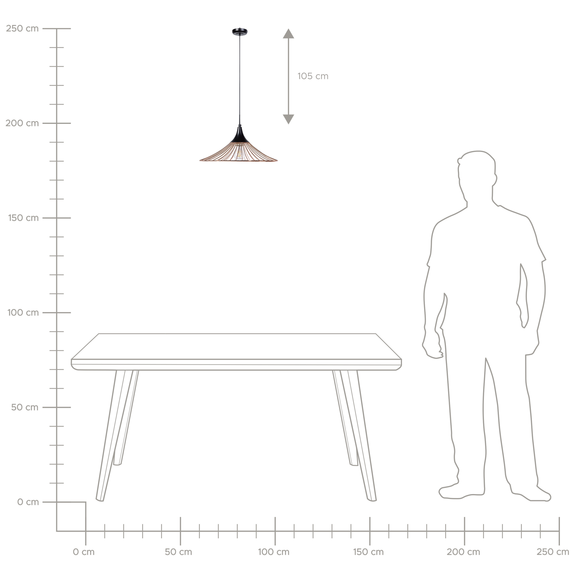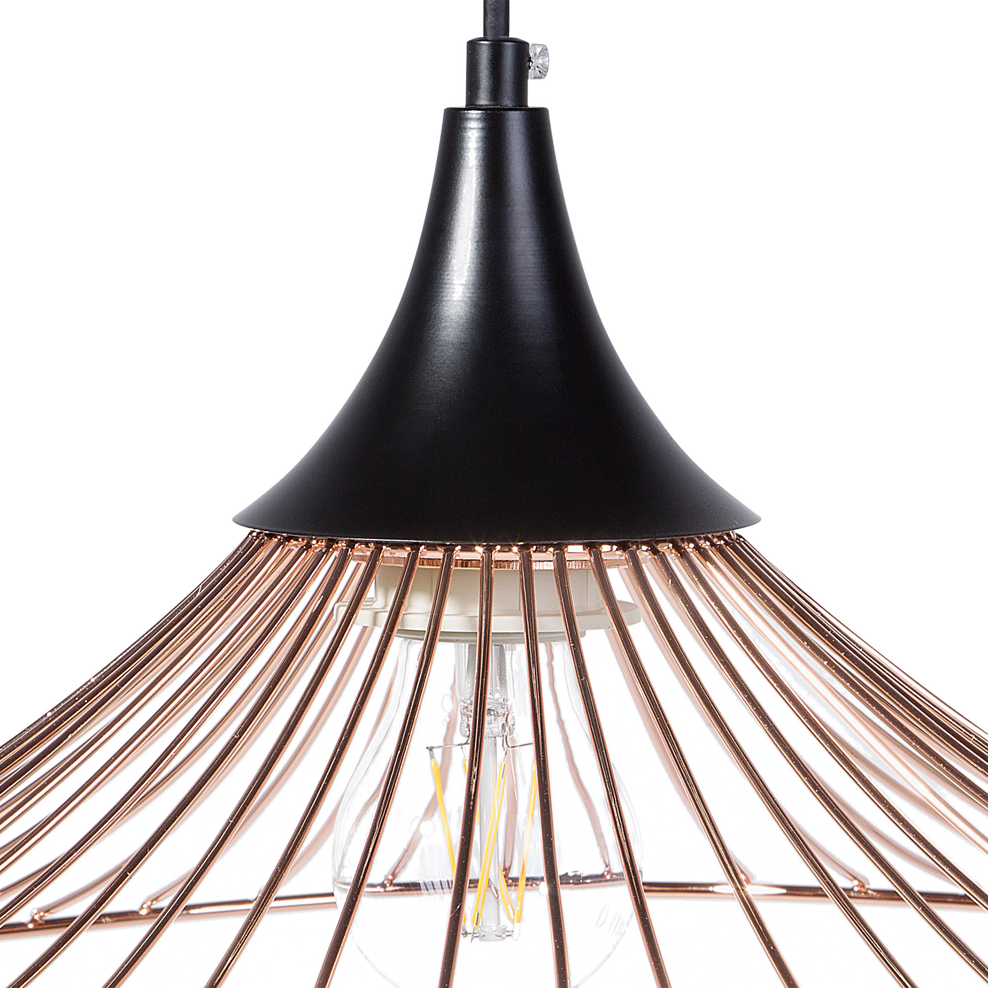 Der runde Lampenschirm der Pendelleuchte ist aus einem kupferfarbenen Metallgeflecht gefertigt und wird trichterförmig nach unten breiter. Die offene Struktur der Metallstreben bringt ein effektvolles Lichtspiel in Ihren Raum. Material: Metall. Zusätzliches Material: PVC. Gewicht: 1 Montage: Erfordert Installation und Montage Das Angebot beinhaltet: 1 x Hängeleuchte, Nicht im Lieferumfang enthalten: Leuchtmittel Höhe: 128 zusätzliche Information: Diese Leuchte ist geeignet für Leuchtmittel der Energieklassen A bis G auf einer Skala von A (sehr effizient) bis G (weniger effizient). Geeignet für: LED Leuchtmittel, Eco-Halogen Leuchtmittel, Energiesparleuchtmittel., Die Stromkabel dürfen nur von einem qualifizierten Elektriker angepasst werden. Breite: 40 Tiefe: 40 Art: Hängeleuchte Stil: Modern Allgemeine Farbe: Kupfer Hauptmaterial: Metall Fassung: Max. 40 W IP Protection Code: IP 20