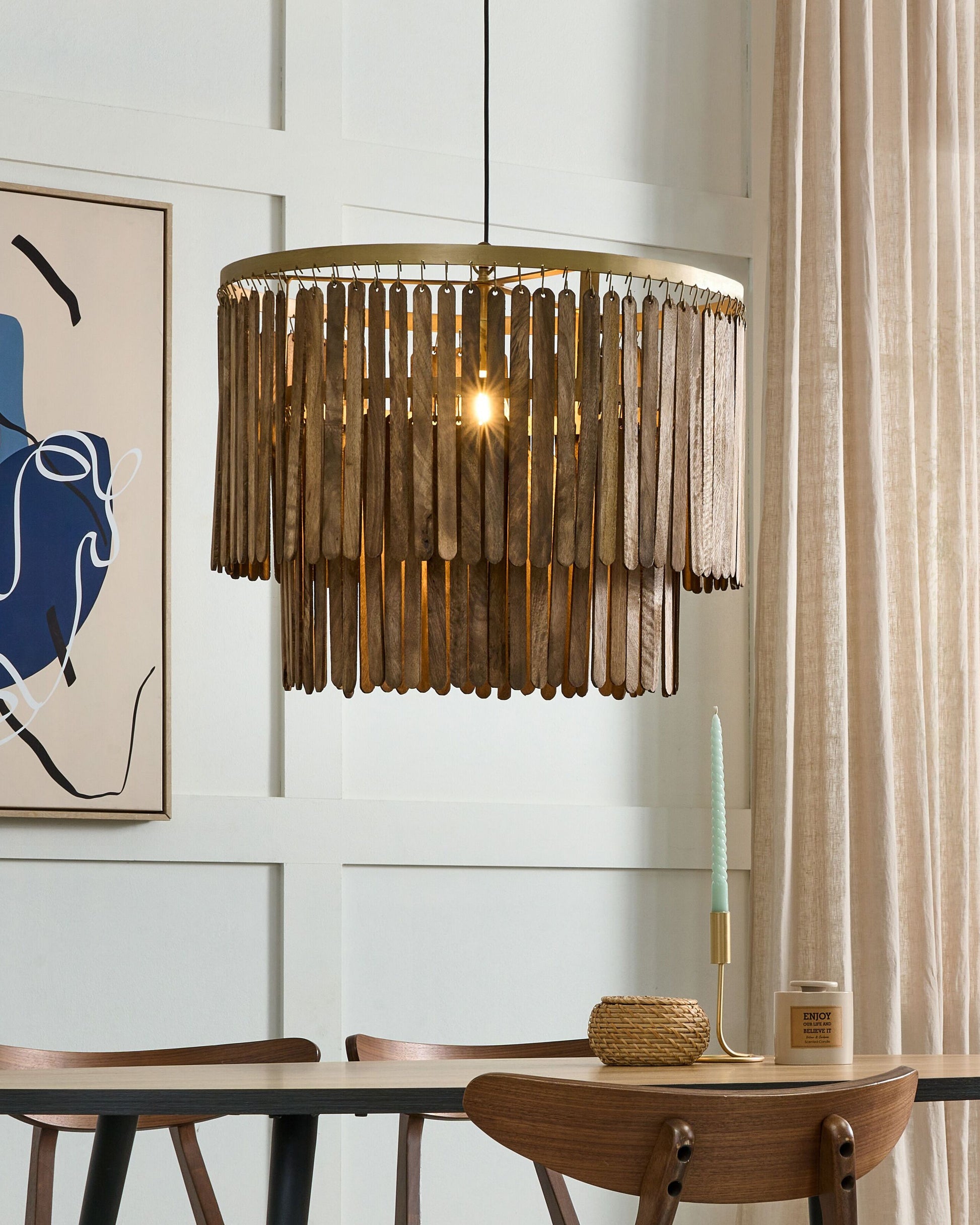 Beschreibung: Diese Leuchte besticht mit ihrer einzigartigen Lamellen-Optik, die auch an einen Wasserfall erinnert. Die schlanken Lamellen bestehen aus hochwertigem Mango-Holz und sind von Hand gefertigt worden, was der Pendelleuchte auch Originalität verleiht. Der messingfarbene Metallring dient nicht nur als Ergänzung zum rustikalen Look der Holzleuchte, sondern bildet auch einen vortrefflichen Eyecatcher. Dank des offenen Holzlamellenschirms kreieren die Lichtstrahlen wundervolle Schatteneffekte und verteilten das Licht auch gleichmässig im Raum. Dadurch spendet sie einen angenehmen, stimmungsvollen Lichtschein, der sich perfekt zur Beleuchtung des Essbereichs oder anderer alltäglicher Räume eignet. Material: Mango Holz. Zusätzliches Material: Eisen. Gewicht: 3 Montage: Installation benötigt Holzart: Mangifera indica Holzursprung: Indien Das Angebot beinhaltet: 1 x Hängeleuchte, Nicht im Lieferumfang enthalten: Leuchtmittel Höhe: 146 zusätzliche Information: Die Stromkabel dürfen nur von einem qualifizierten Elektriker angepasst werden., Da jedes Produkt handgefertigt wird, kann es zu kleineren Abweichungen in der Farbe und der äusseren Struktur kommen. Diese Abweichungen stellen keinen Qualitätsmangel dar, sondern sind eine warentypische Eigenschaft., Der sichtbare Alterungseffekt, sowie jede Art von Verfärbung oder Abnutzung sind absichtlich und stellen keinen Qualitätsmangel des Produkts dar., Holz ist ein Naturprodukt. Farb- und Strukturunterschiede, Narben, Falten und sonstige Naturmerkmale sind Echtheitsbeweise und keine zur Reklamation berechtigende Fehler. Breite: 60 Tiefe: 60 Art: Hängelampe Stil: Rustikal Allgemeine Farbe: Dunkler Holzfarbton Hauptmaterial: Mango Holz Fassung: 40 W IP Protection Code: IP 20