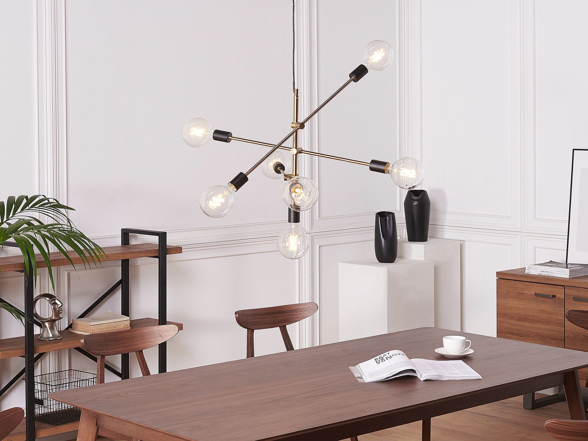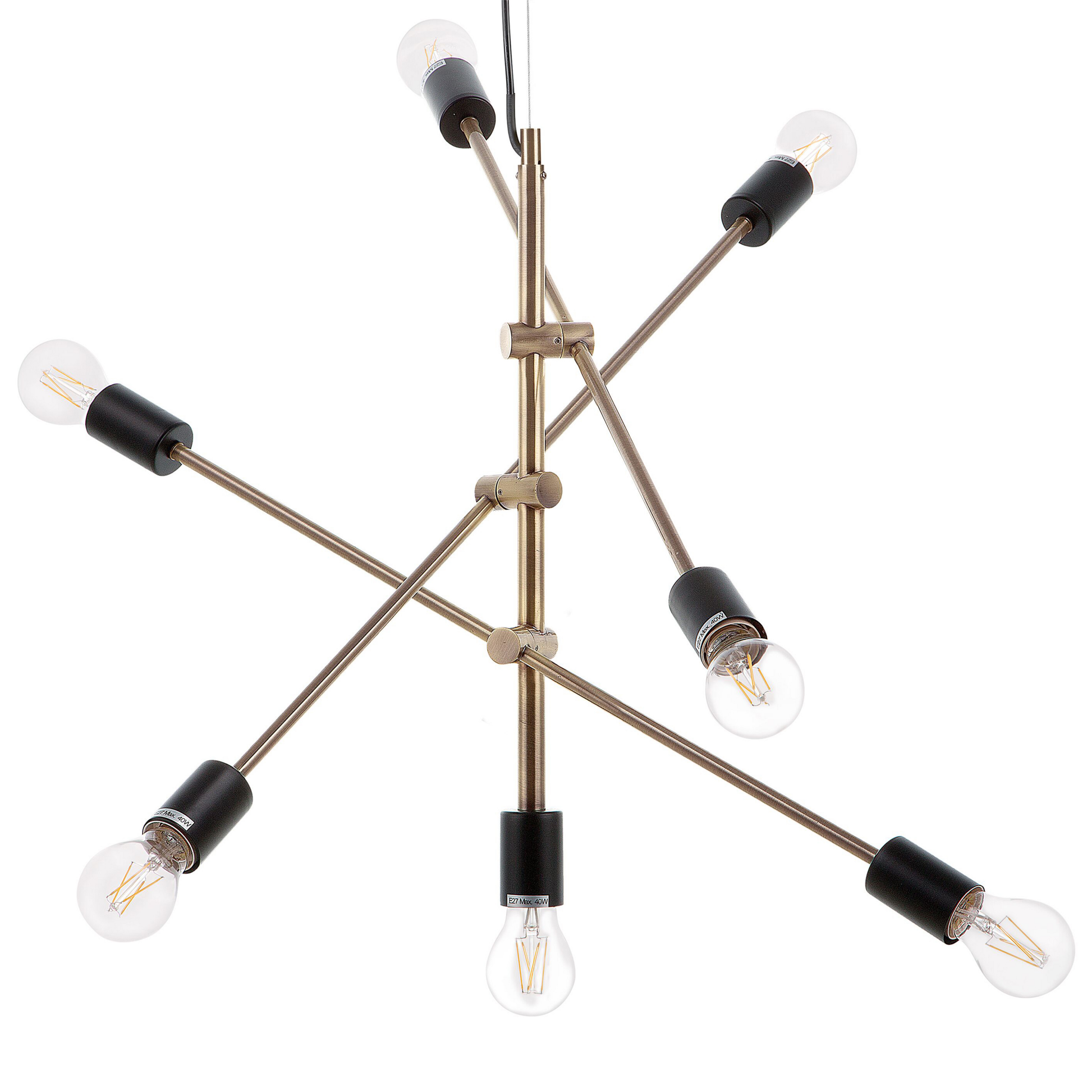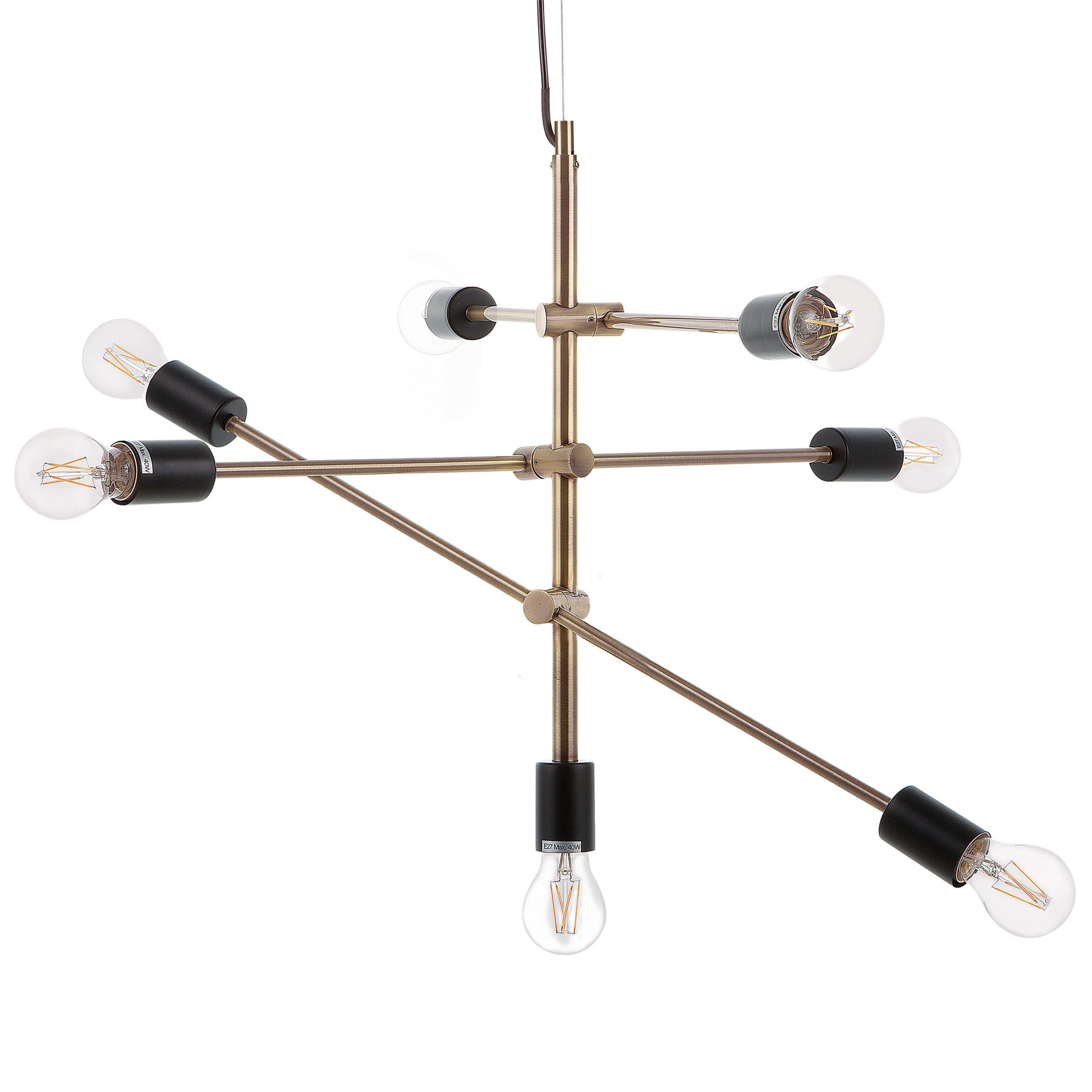 Sowohl in einem modernen wie auch in einem klassischen Interieur kommt diese Pendelleuchte wie ein Kunstwerk zur Geltung. Die 7-flammige Lampe besteht aus höhenversetzt befestigten Stäben, welche sich um eine Mittelachse drehen und schwenken lassen. Die Oberfläche aus gebürstetem Metall in einem angesagten Messingfarbton setzt in jedem Wohn-, Ess- oder Schlafzimmer einen kräftigen Akzent, während die freiliegenden Glühbirnen helle Akzente setzen und das Licht perfekt verteilen. Ihre gradlinige Form verstärkt das moderne, minimalistische Design und verleiht der Leuchte somit eine sehr individualistische Ausstrahlung. Zudem ist die Raumlampe mit einem schwarzen Kabel ausgestattet. Material: Eisen. Zusätzliches Material: PVC. Gewicht: 2 Montage: Installation benötigt Das Angebot beinhaltet: 1 x Hängeleuchte, Nicht im Lieferumfang enthalten: Leuchtmittel Höhe: 126 zusätzliche Information: Diese Leuchte ist geeignet für Leuchtmittel der Energieklassen A bis G auf einer Skala von A (sehr effizient) bis G (weniger effizient). Geeignet für: LED Leuchtmittel, Eco-Halogen Leuchtmittel, Energiesparleuchtmittel., Die Stromkabel dürfen nur von einem qualifizierten Elektriker angepasst werden. Breite: 52 Tiefe: 74 Art: Hängelampe Stil: Modern Allgemeine Farbe: Messing Hauptmaterial: Eisen Fassung: Max. 40 W IP Protection Code: IP 20