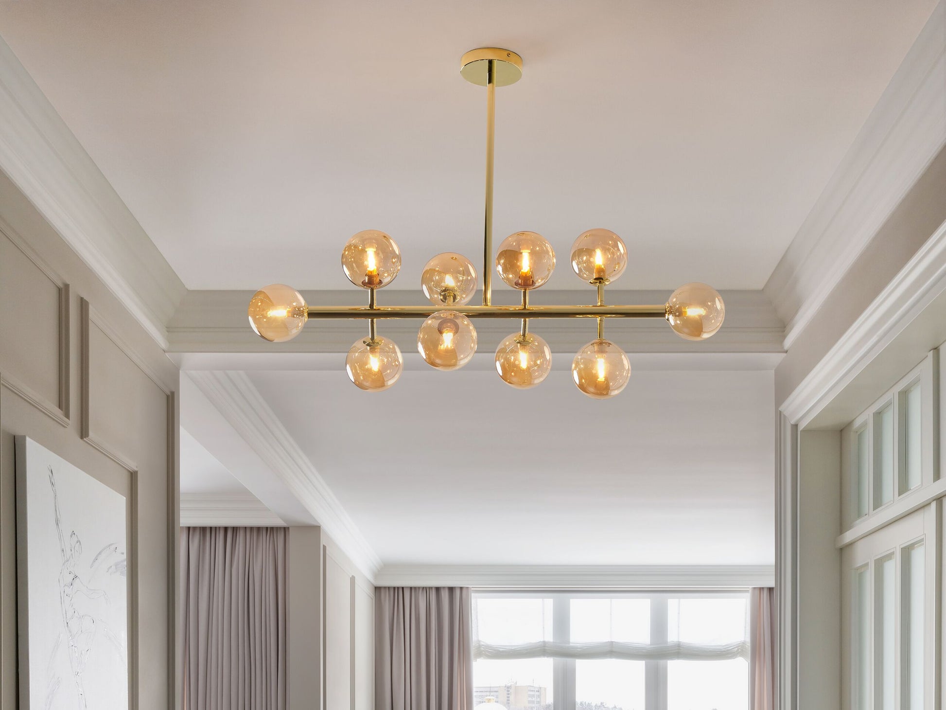 Diese Hängelampe verleiht dem Wohnraum eine unverwechselbare, glamouröse Note. Das Design mit 10 Lichtern ermöglicht die Beleuchtung sogar in grösseren Räumen und lässt sich mit verschiedenen Einrichtungsstilen kombinieren. Dank der halbtransparenten Glühlampe lässt sich die Leuchte auch gut mit dekorativen Glühbirnen kombinieren. Da sie aus Stahl gefertigt wurde, benötigt keine tägliche Pflege und hält viele Jahre lang. Material: Stahl. Zusätzliches Material: Glas. Gewicht: 3 Montage: Erfordert Installation und Montage Das Angebot beinhaltet: 1 x Hängeleuchte, Nicht im Lieferumfang enthalten: Leuchtmittel Höhe: 68 Breite: 90 Tiefe: 34 Art: Hängelampe Stil: Glamourös Allgemeine Farbe: Gold Hauptmaterial: Stahl Fassung: 28 W IP Protection Code: IP 20